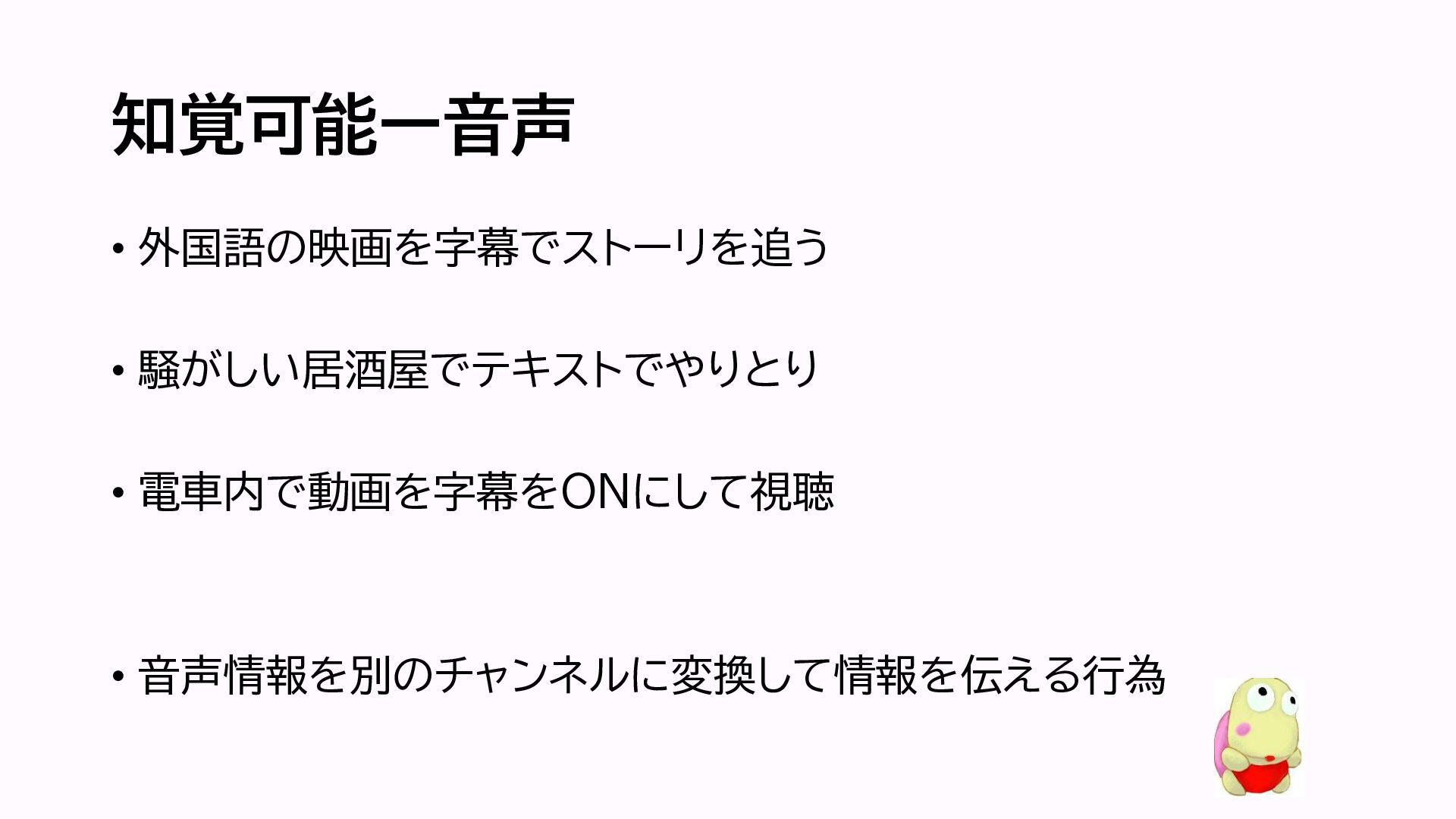 知覚可能ー音声 • 外国語の映画を字幕でストーリを追う • 騒がしい居酒屋でテキストでやりとり • 電車内で動画を字幕をONにして視聴 • 音声情報を別のチャンネルに変換して情報を伝える行為