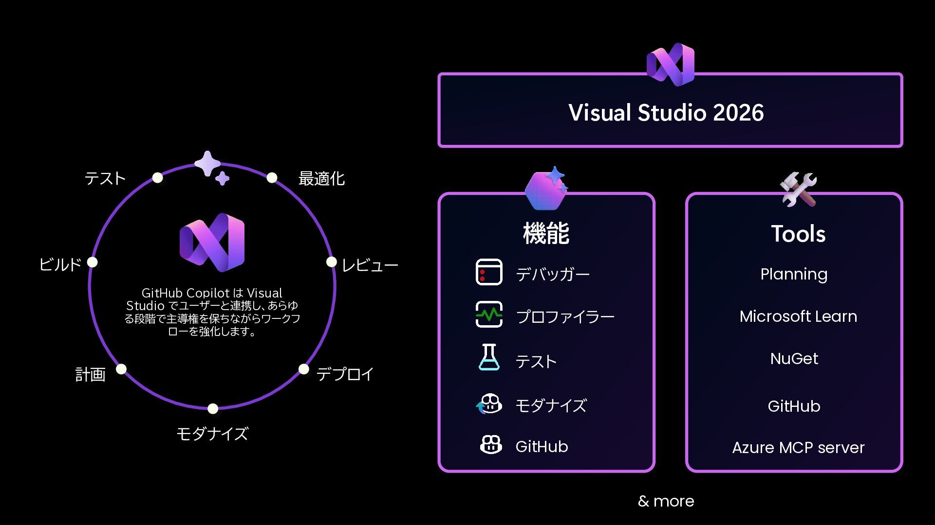 テスト モダナイズ NuGet Azure MCP server GitHub Copilot は Visual Studio でユーザーと連携し、あらゆ る段階で主導権を保ちながらワークフ ローを強化します。 テスト 最適化 レビュー モダナイズ 計画 デプロイ ビルド GitHub Microsoft Learn Visual Studio 2026 GitHub & more