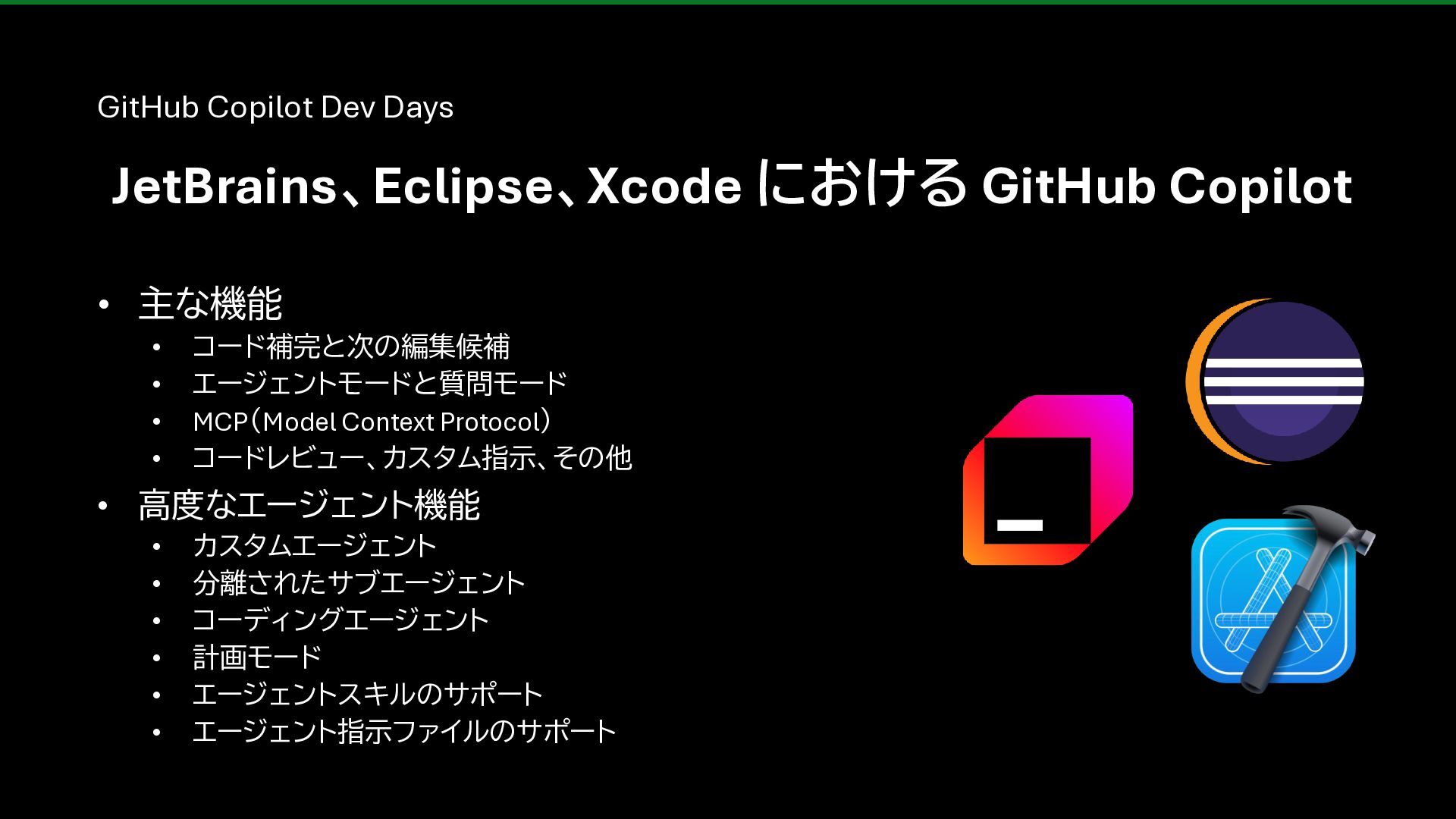 • コードレビュー、カスタム指示、その他 • 高度なエージェント機能 • カスタムエージェント • 分離されたサブエージェント • コーディングエージェント • 計画モード • エージェントスキルのサポート • エージェント指示ファイルのサポート GitHub Copilot Dev Days JetBrains、Eclipse、Xcode における GitHub Copilot