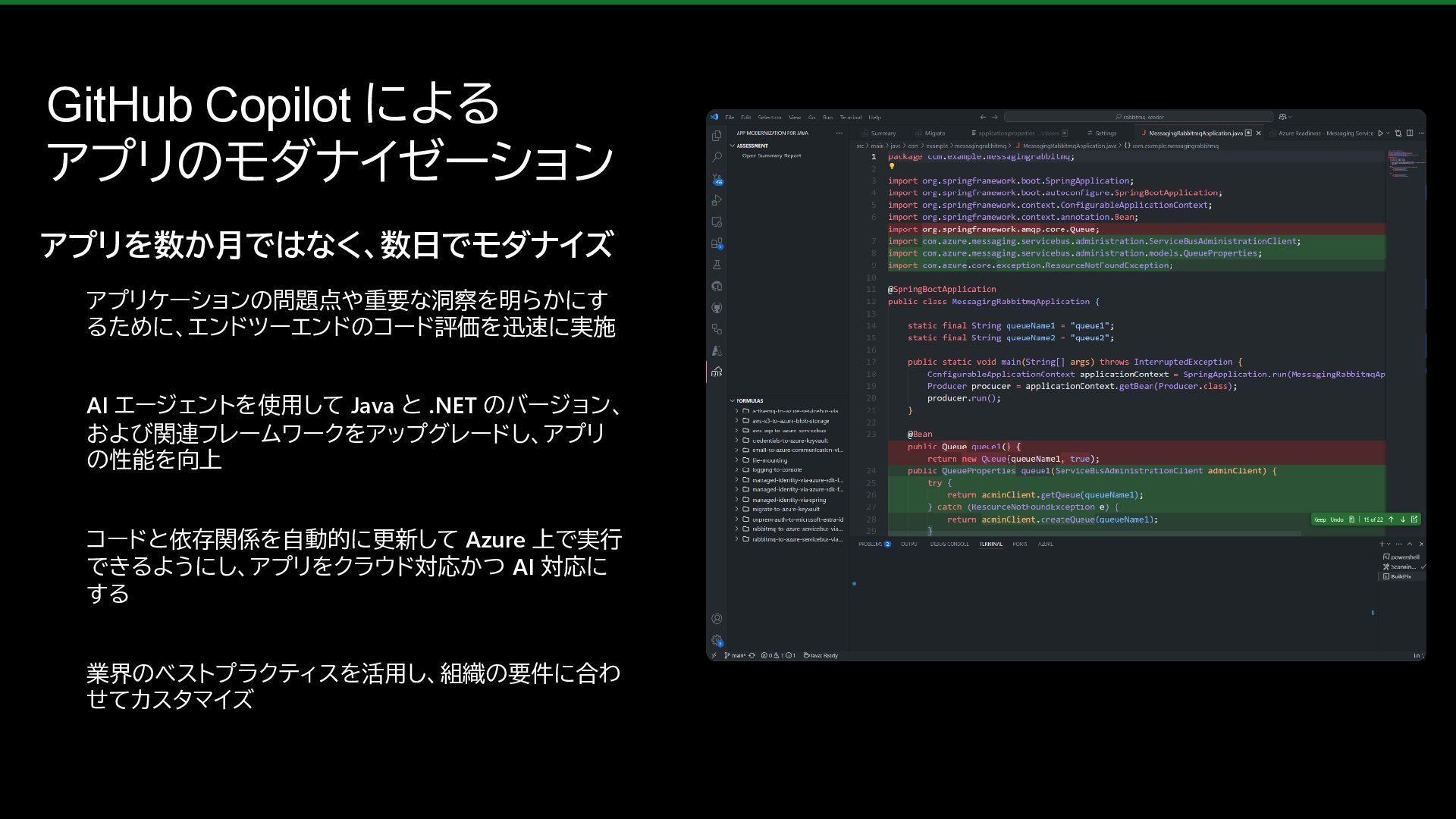 8. GitHub Copilot による アプリのモダナイゼーション アプリを数か月ではなく、数日でモダナイズ アプリケーションの問題点や重要な洞察を明らかにす るために、エンドツーエンドのコード評価を迅速に実施 AI エージェントを使用して Java