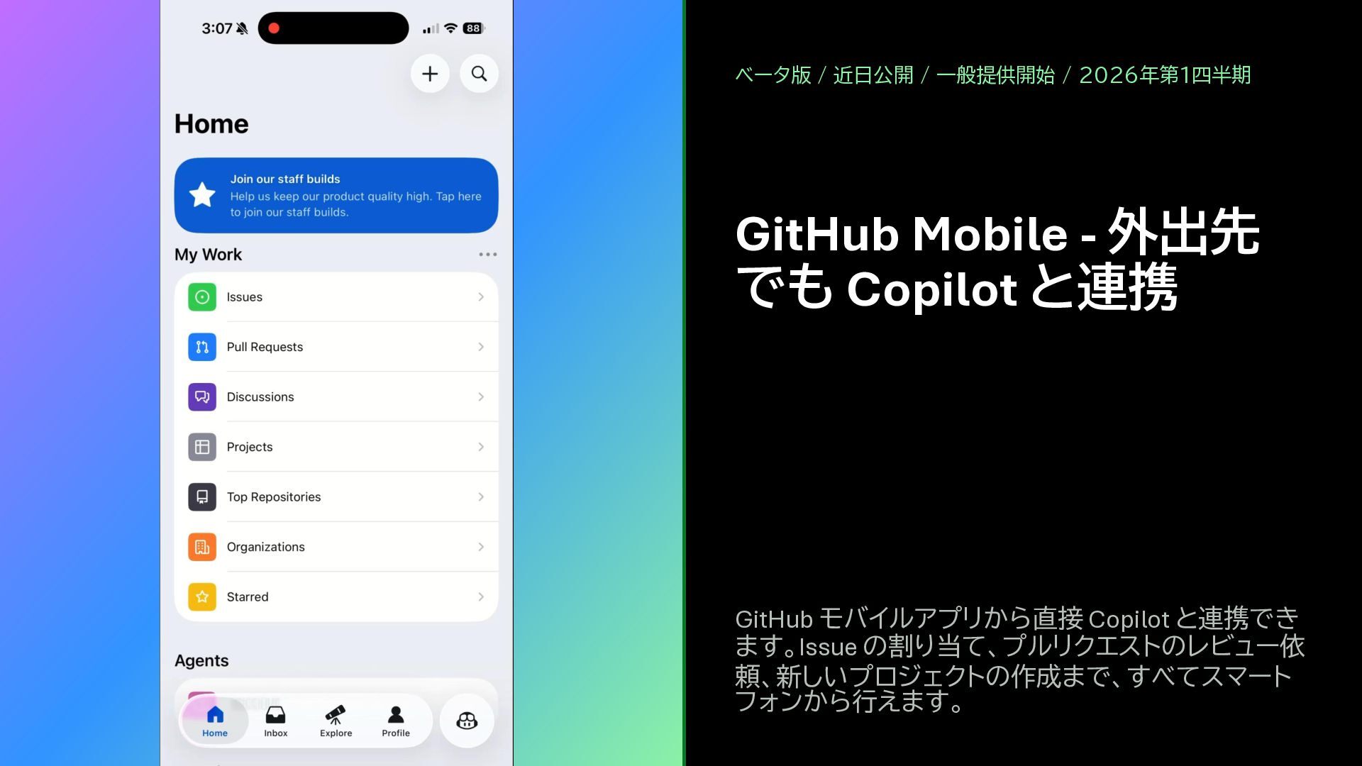 / 一般提供開始 / 2026年第1四半期 GitHub モバイルアプリから直接 Copilot と連携でき ます。Issue の割り当て、プルリクエストのレビュー依 頼、新しいプロジェクトの作成まで、すべてスマート フォンから行えます。
