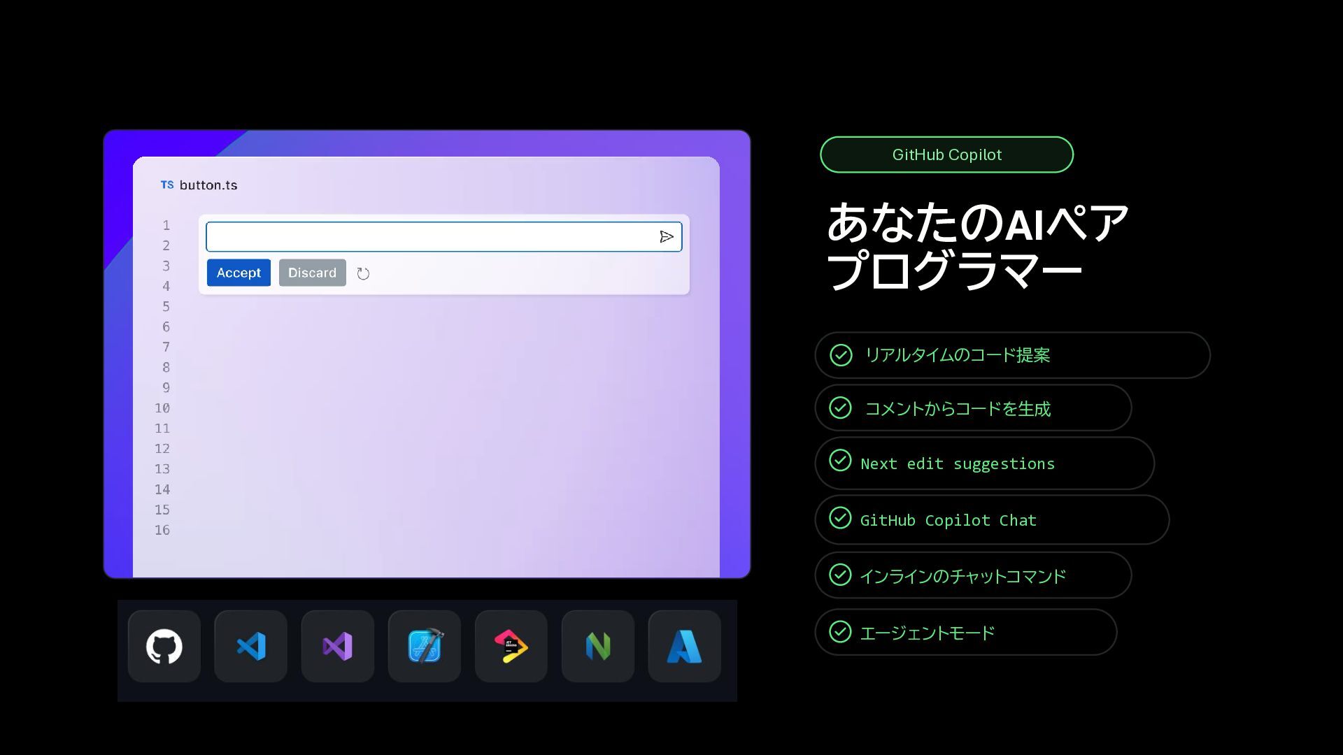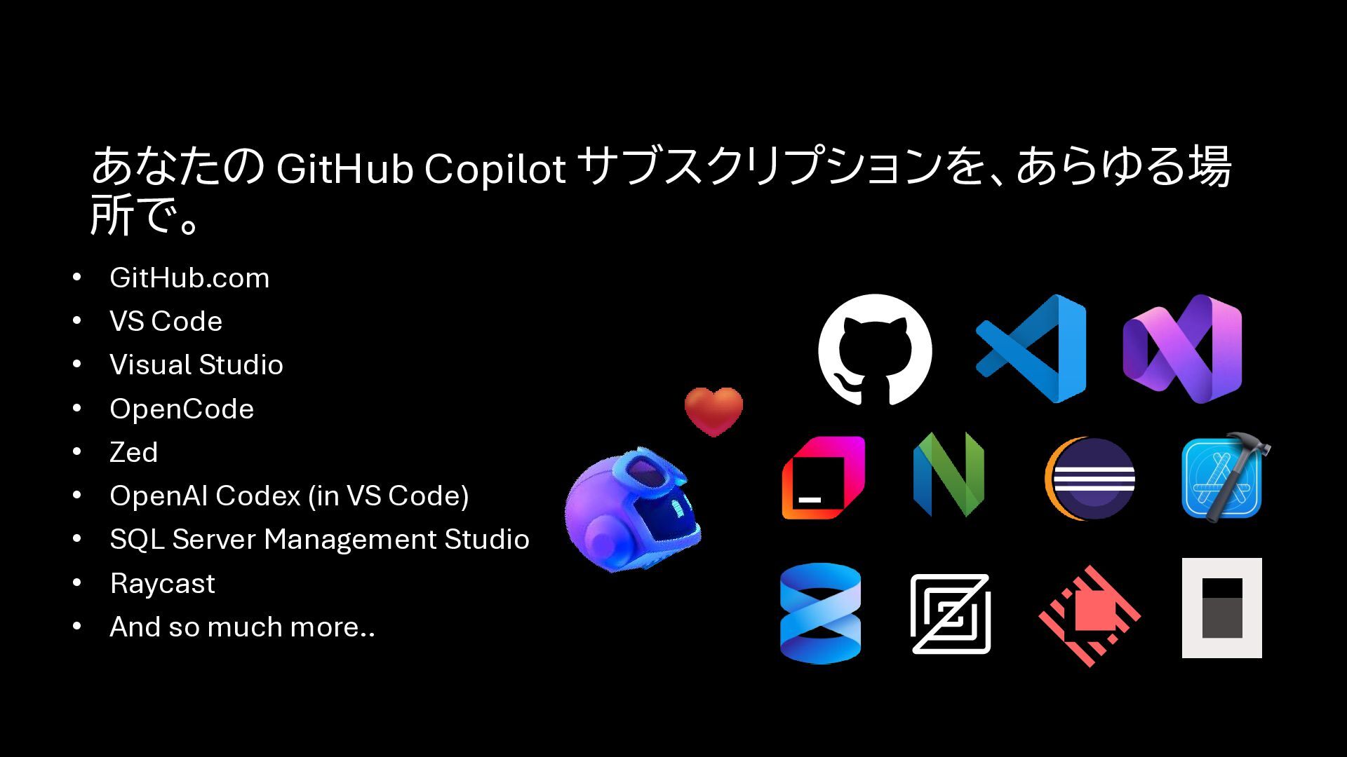 • Zed • OpenAI Codex (in VS Code) • SQL Server Management Studio • Raycast • And so much more.. あなたの GitHub Copilot サブスクリプションを、あらゆる場 所で。