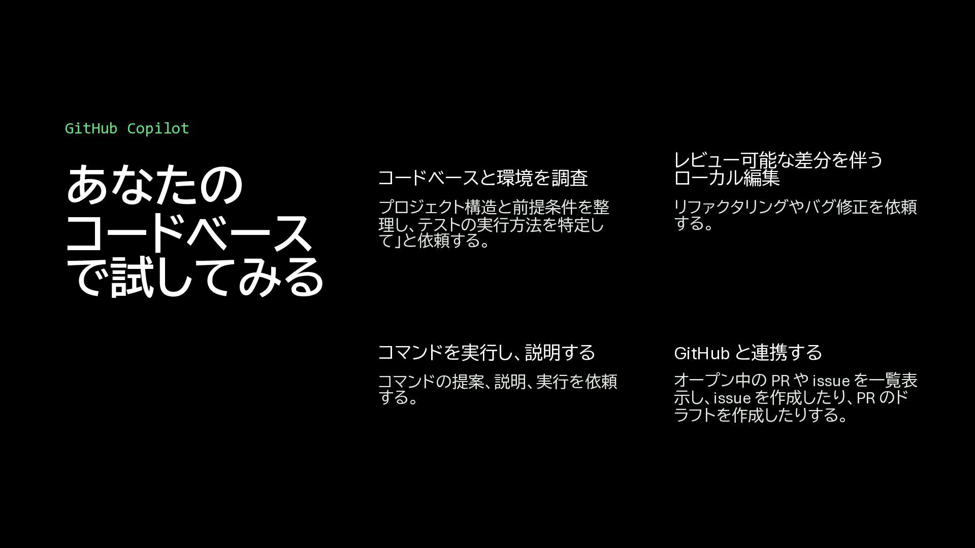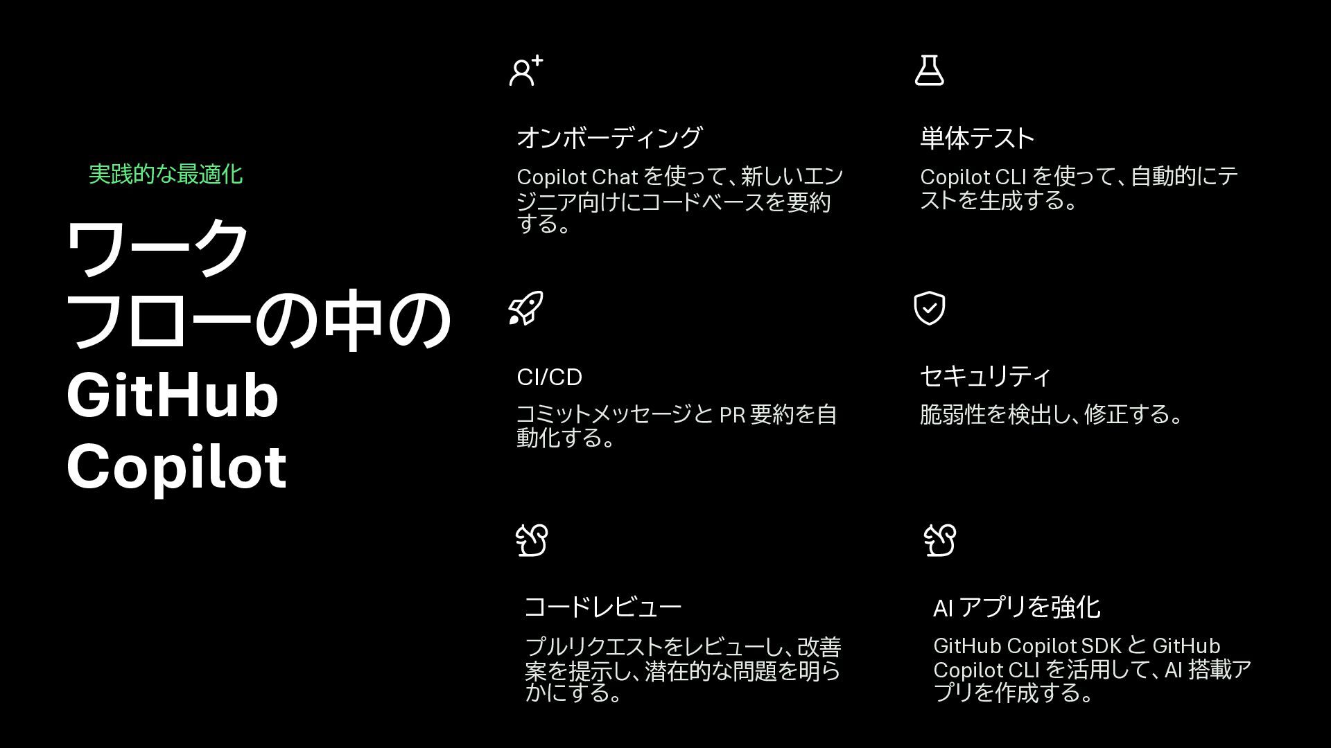 動化する。 単体テスト Copilot CLI を使って、自動的にテ ストを生成する。 セキュリティ 脆弱性を検出し、修正する。 ワーク フローの中の GitHub Copilot 実践的な最適化 コードレビュー プルリクエストをレビューし、改善 案を提示し、潜在的な問題を明ら かにする。 AI アプリを強化 GitHub Copilot SDK と GitHub Copilot CLI を活用して、AI 搭載ア プリを作成する。