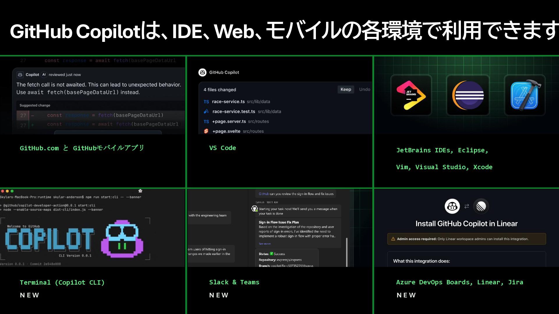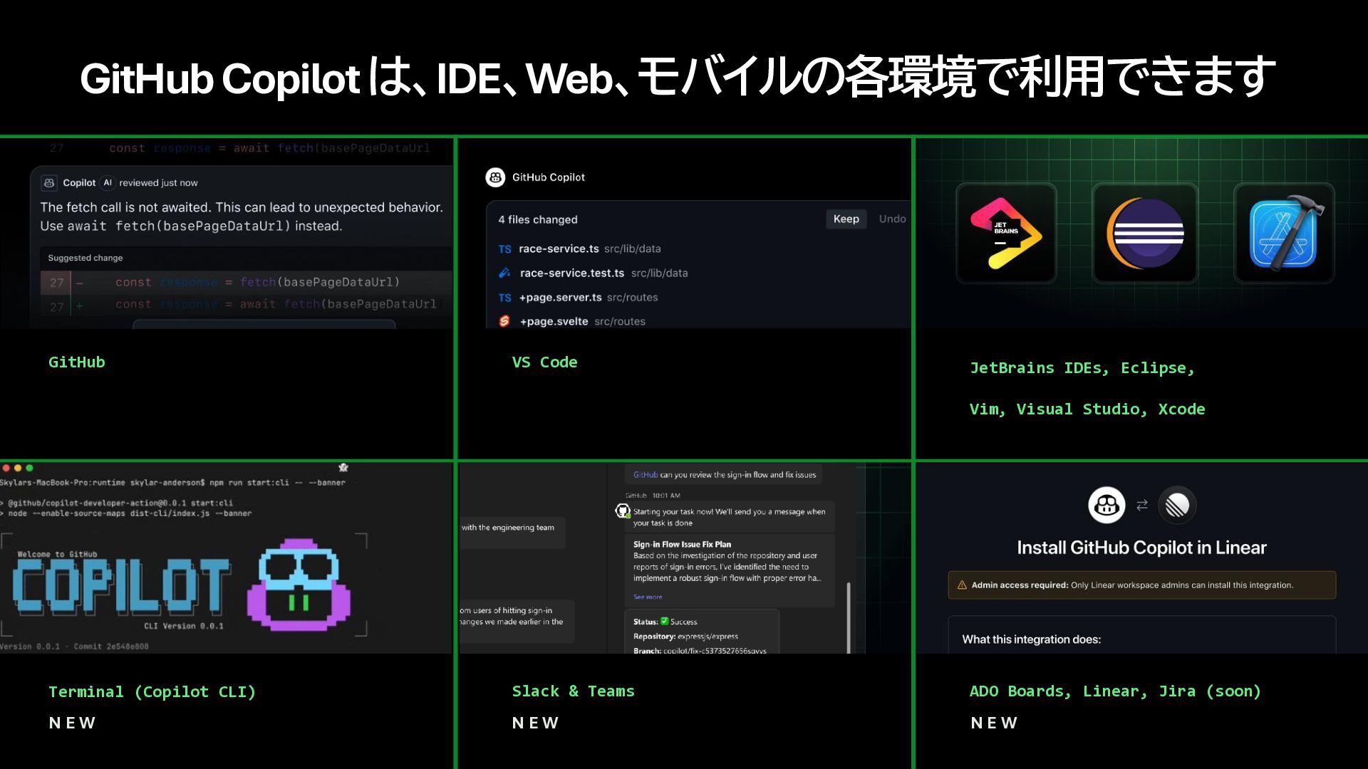3. GitHub Copilotは、IDE、Web、モバイルの各環境で利用できます GitHub.com と GitHubモバイルアプリ Terminal (Copilot CLI) VS Code