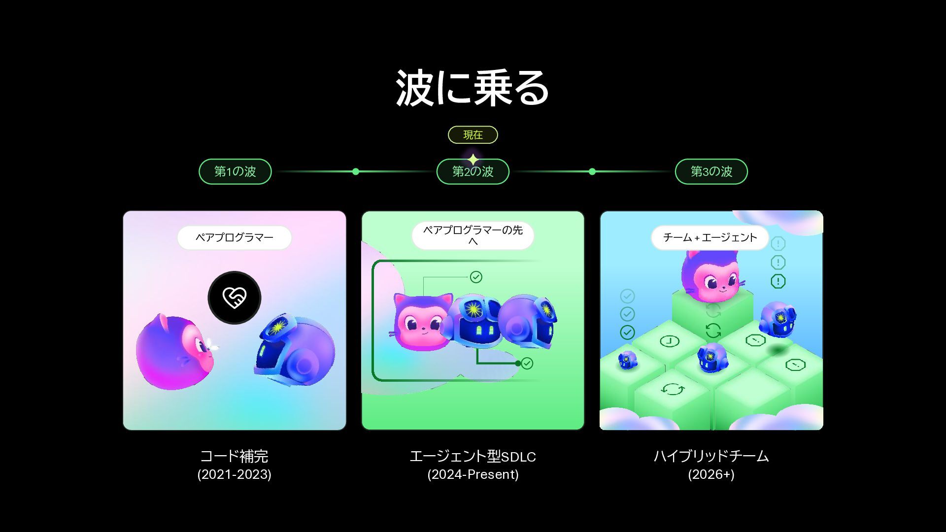 2. エージェント型SDLC (2024-Present) ハイブリッドチーム (2026+) 第1の波 第2の波 第3の波 波に乗る 現在 コード補完