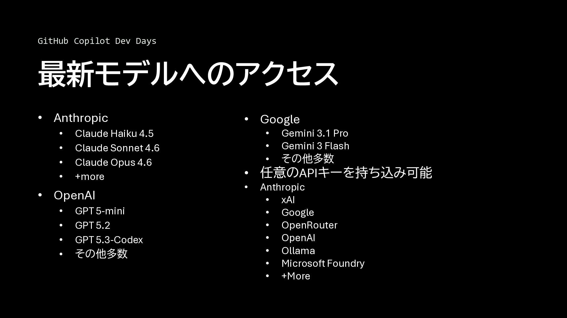 • Claude Opus 4.6 • +more • OpenAI • GPT 5-mini • GPT 5.2 • GPT 5.3-Codex • その他多数 GitHub Copilot Dev Days 最新モデルへのアクセス • Google • Gemini 3.1 Pro • Gemini 3 Flash • その他多数 • 任意のAPIキーを持ち込み可能 • Anthropic • xAI • Google • OpenRouter • OpenAI • Ollama • Microsoft Foundry • +More