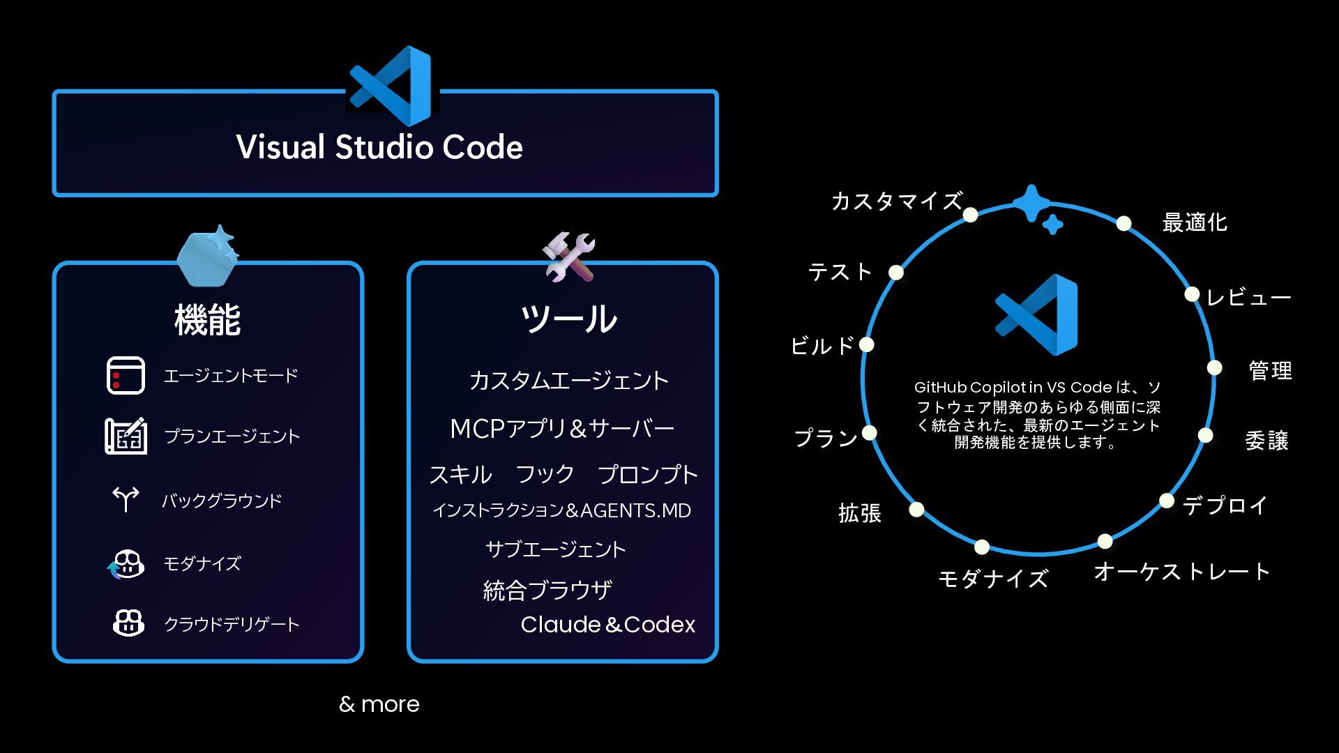 Visual Studio Code フック & more 統合ブラウザ Claude&Codex プロンプト サブエージェント バックグラウンド GitHub Copilot in VS Code は、ソ フトウェア開発のあらゆる側面に深 く統合された、最新のエージェント 開発機能を提供します。 テスト 最適化 レビュー モダナイズ プラン デプロイ ビルド オーケストレート 委譲 拡張 カスタマイズ 管理