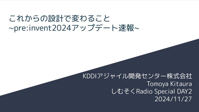 これからの設計で変わること ~pre:invent2024アップデート速報~ KDDIアジャイル開発センター株式会社 Tomoya Kitaura しむそくRadio Special DAY2 2024/11/27