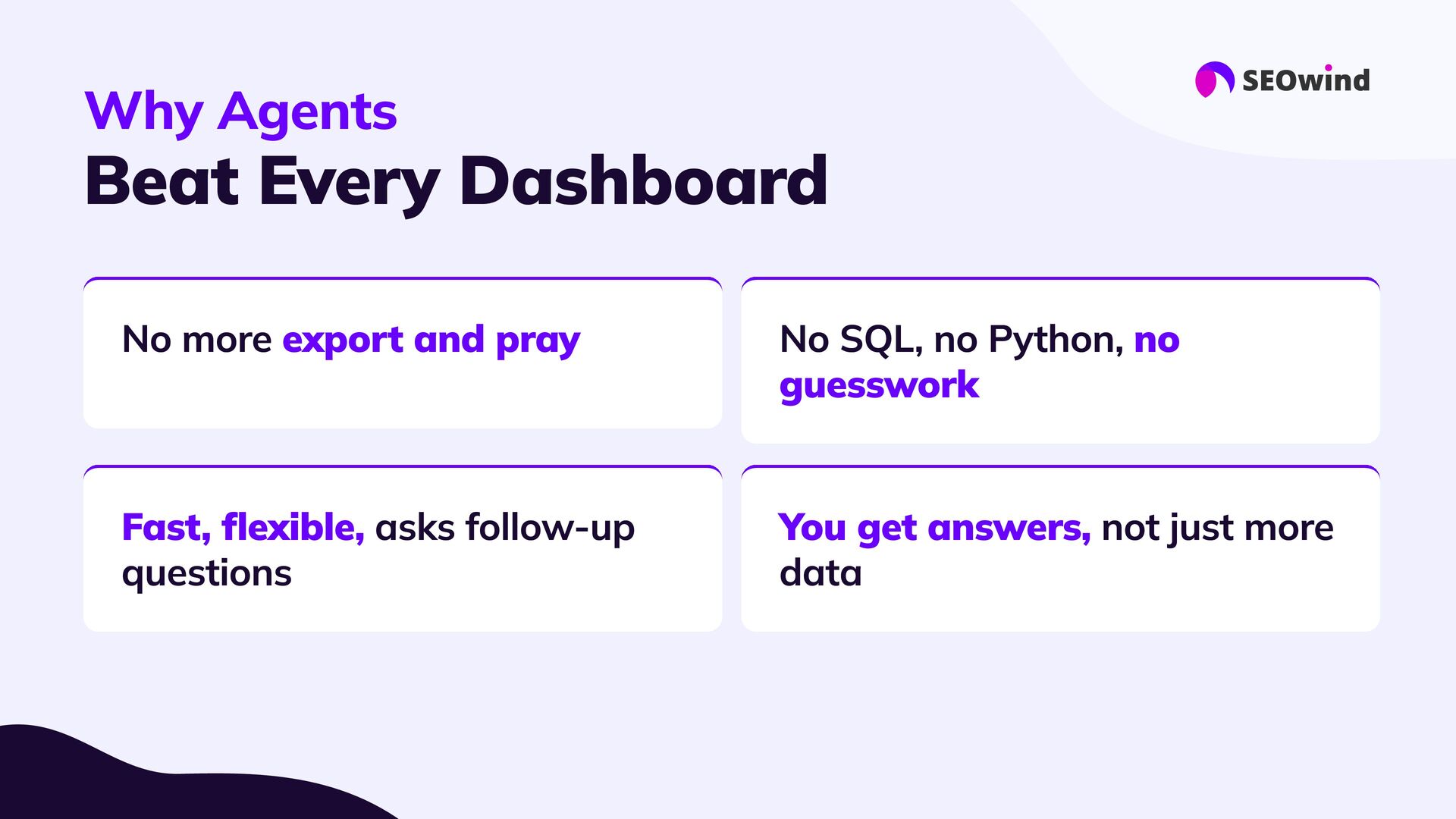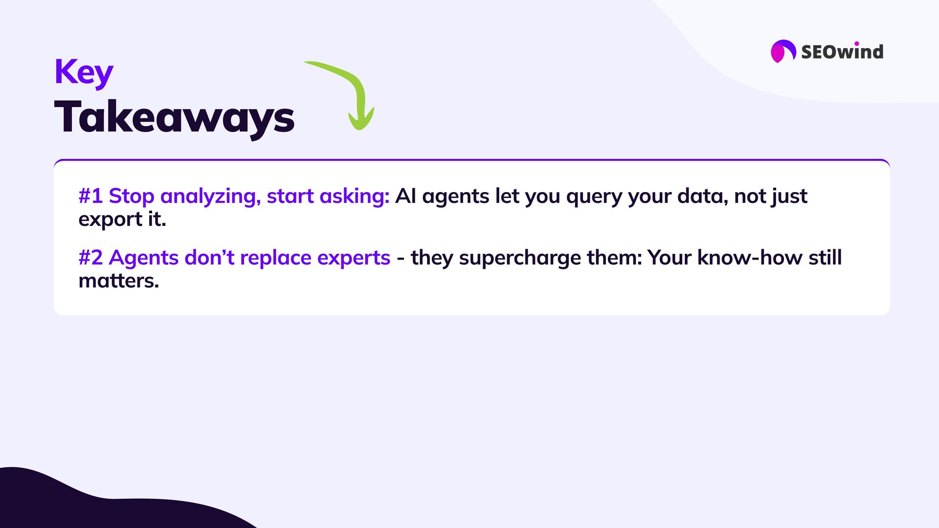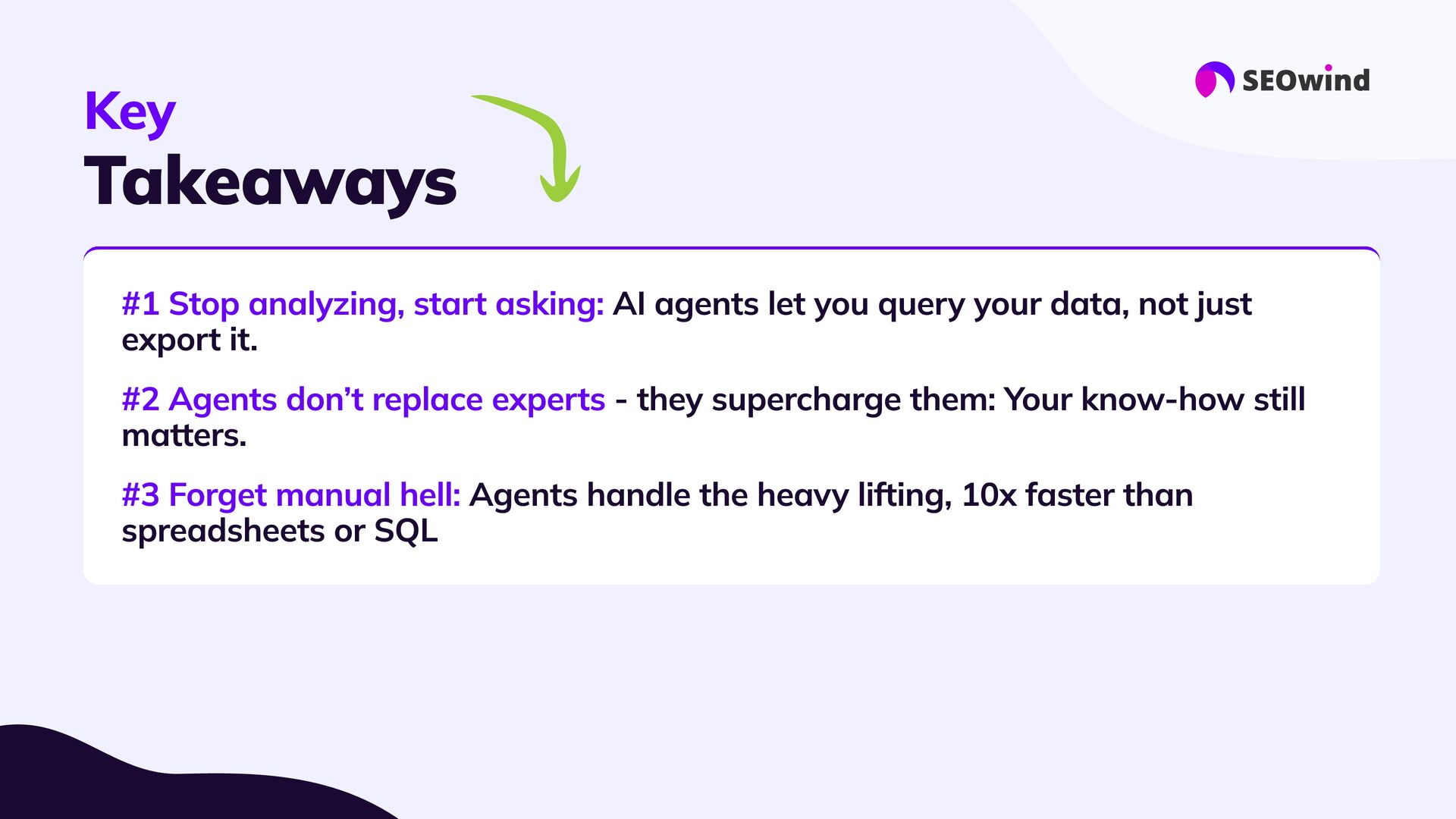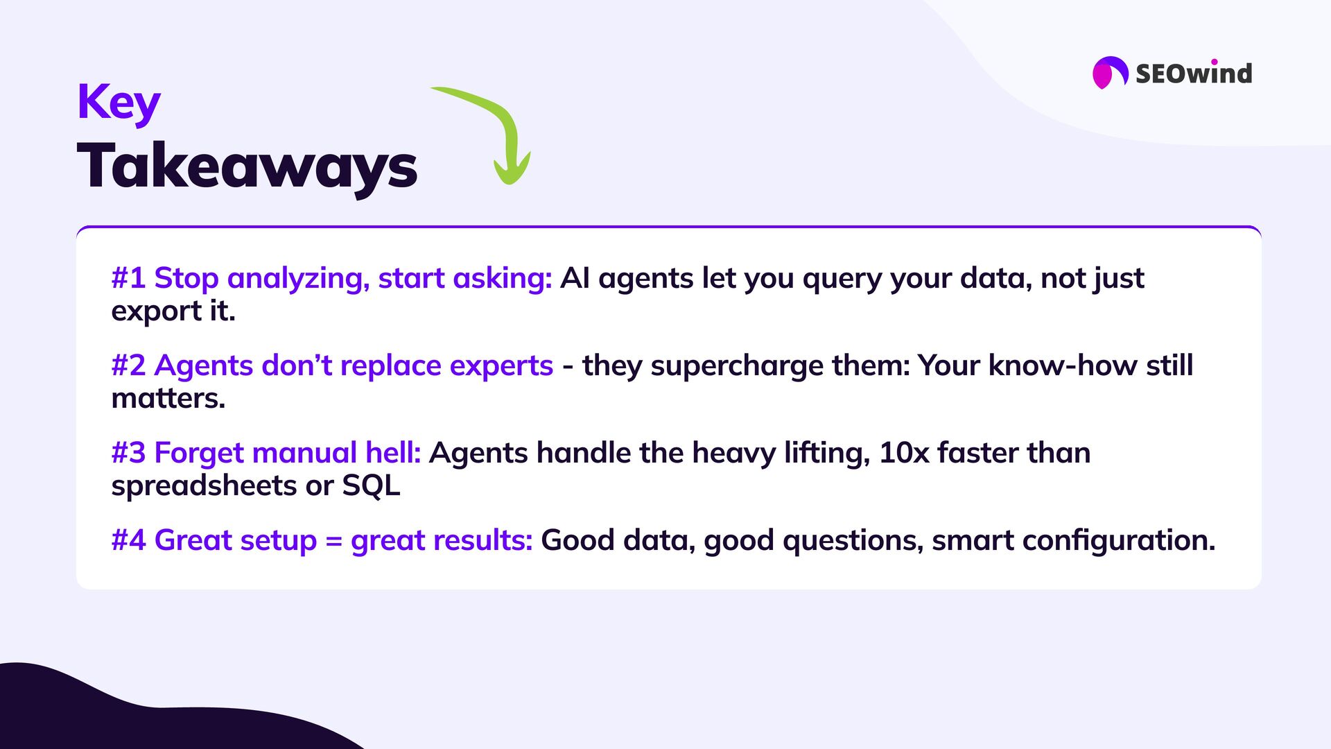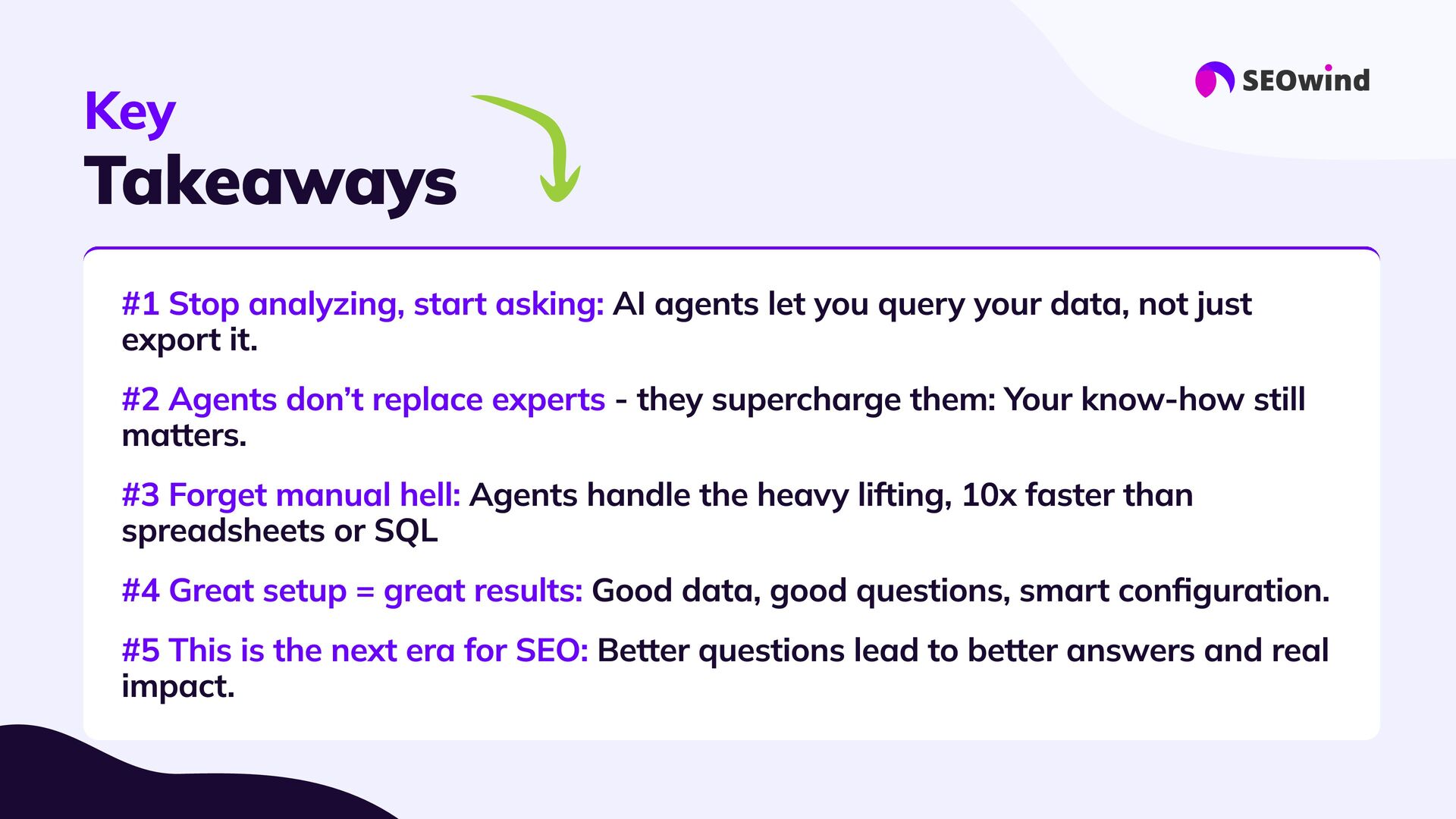 replace experts #3 Forget manual hell: #4 Great setup = great results: #5 This is the next era for SEO: AI agents let you query your data, not just export it. - they supercharge them: Your know-how still matters. Agents handle the heavy lifting, 10x faster than spreadsheets or SQL Good data, good questions, smart configuration. Better questions lead to better answers and real impact.