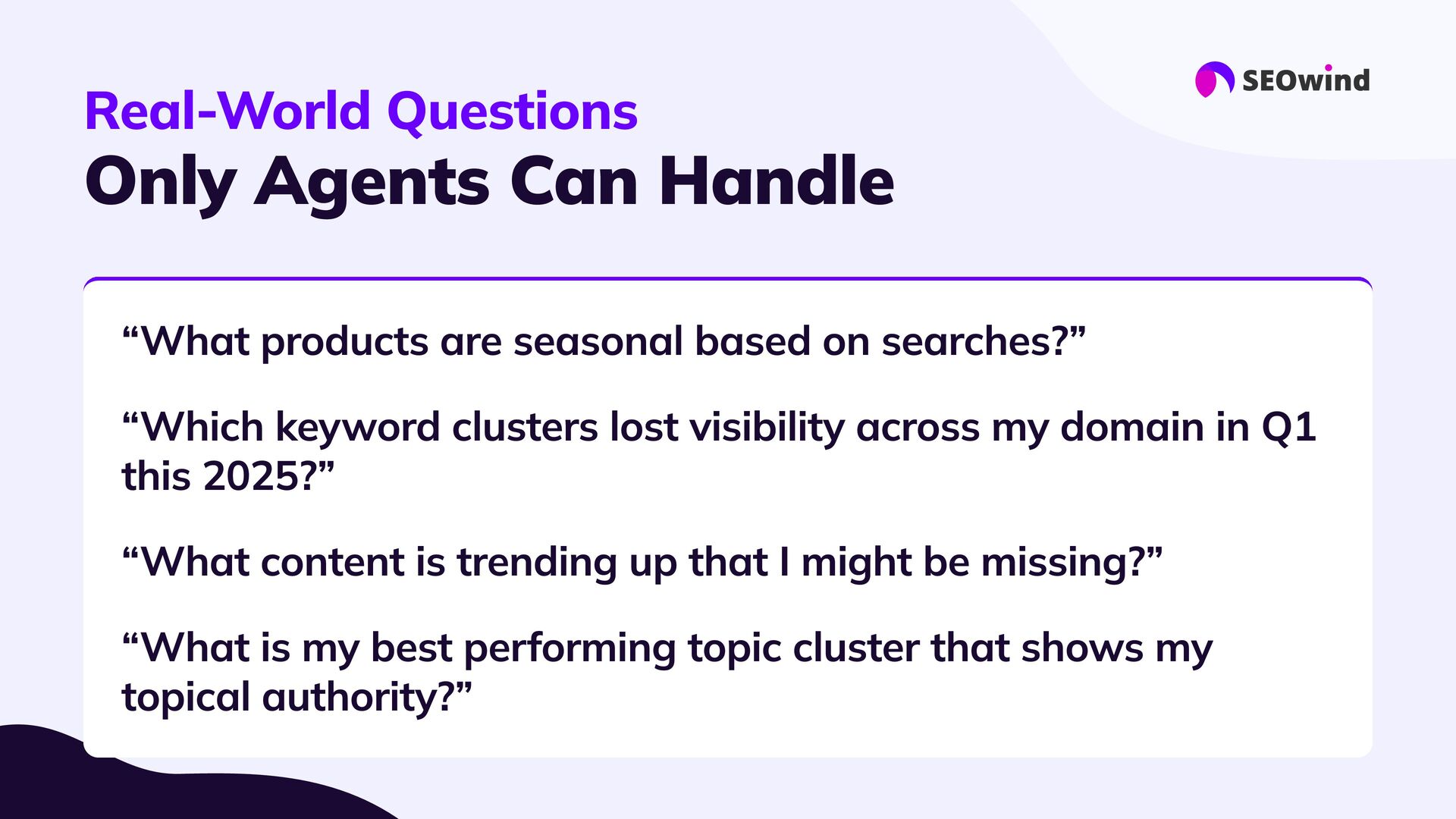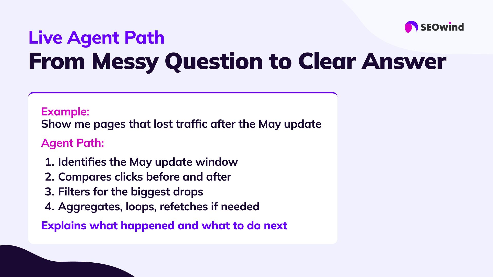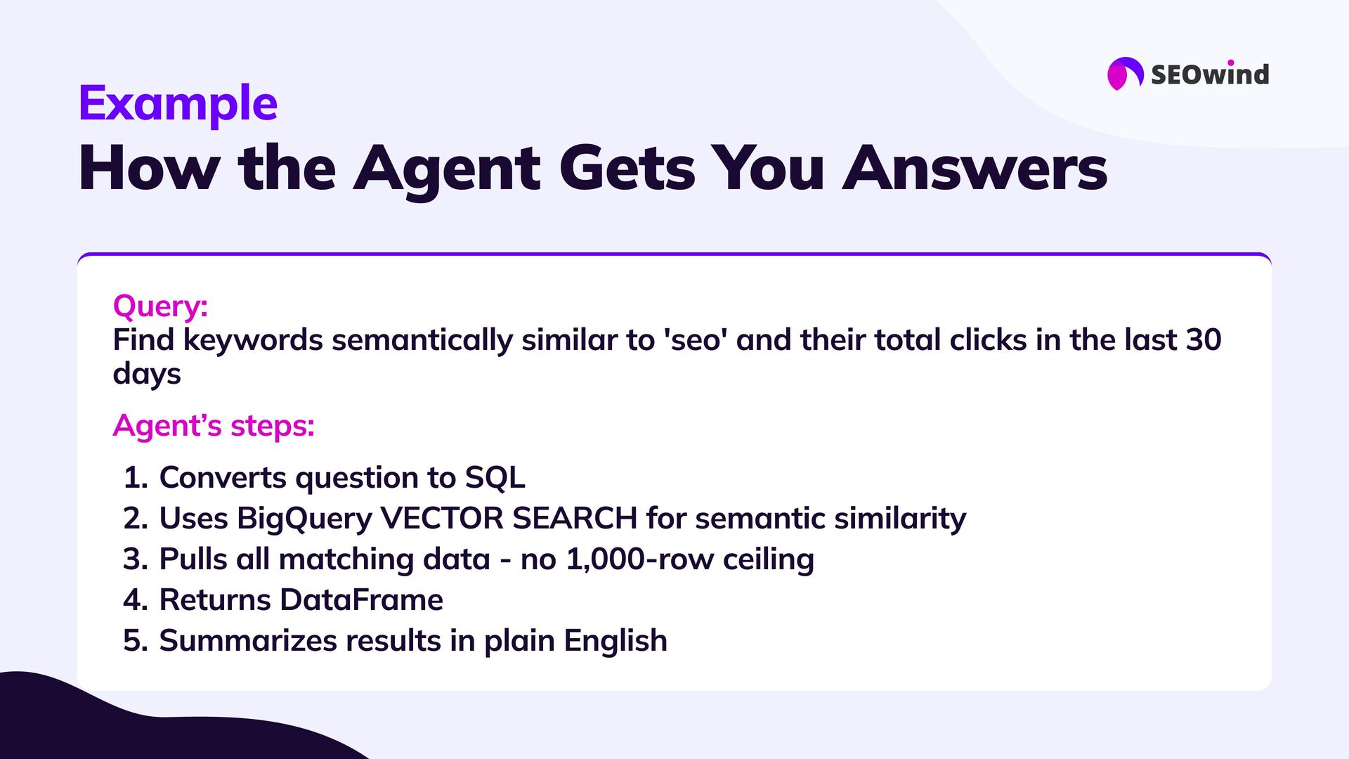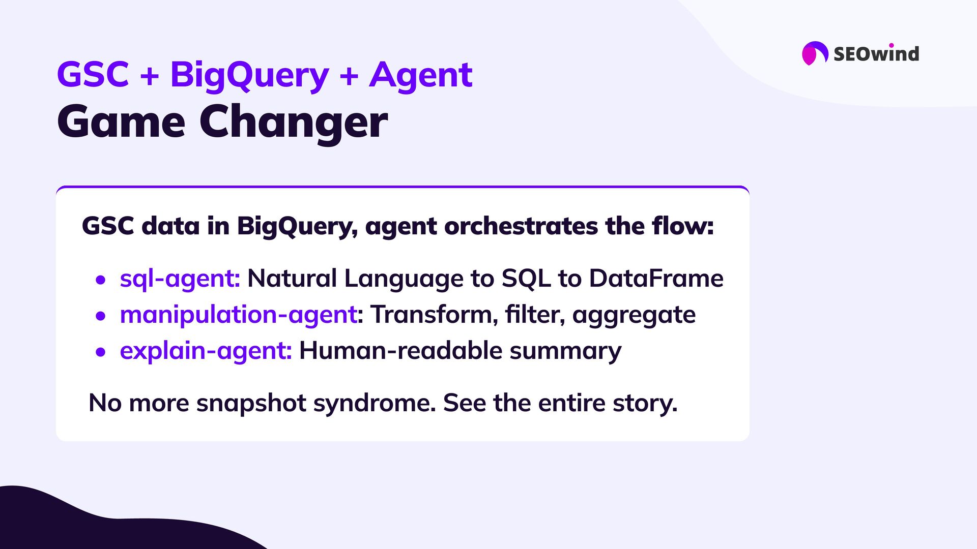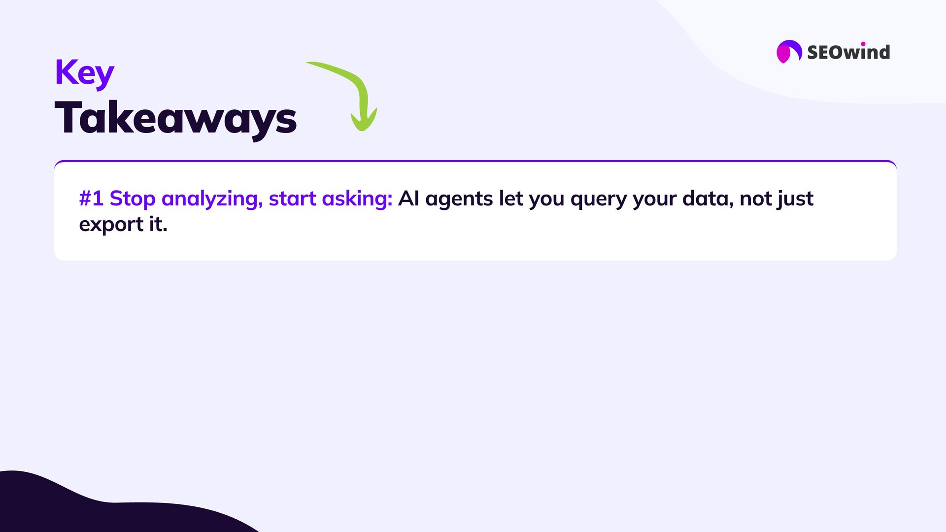 replace experts #3 Forget manual hell: #4 Great setup = great results: #5 This is the next era for SEO: AI agents let you query your data, not just export it. - they supercharge them: Your know-how still matters. Agents handle the heavy lifting, 10x faster than spreadsheets or SQL Good data, good questions, smart configuration. Better questions lead to better answers and real impact.