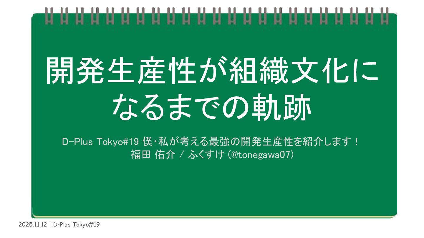 2025.11.12 | D-Plus Tokyo#19 開発生産性が組織文化に なるまでの軌跡 D-Plus Tokyo#19 僕・私が考える最強の開発生産性を紹介します! 福田