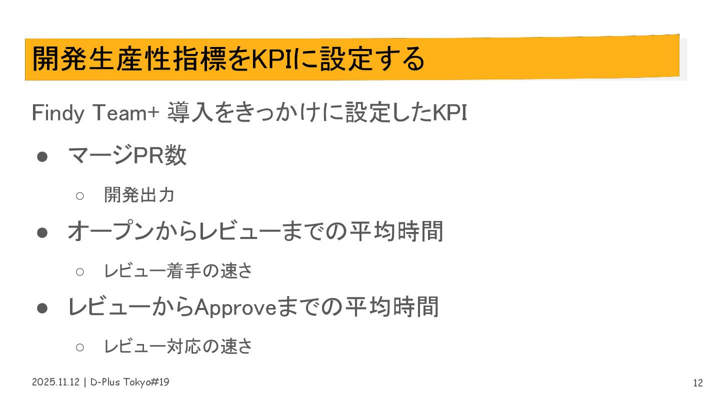2025.11.12 | D-Plus Tokyo#19 開発生産性指標をKPIに設定する Findy Team+ 導入をきっかけに設定したKPI • マージPR数