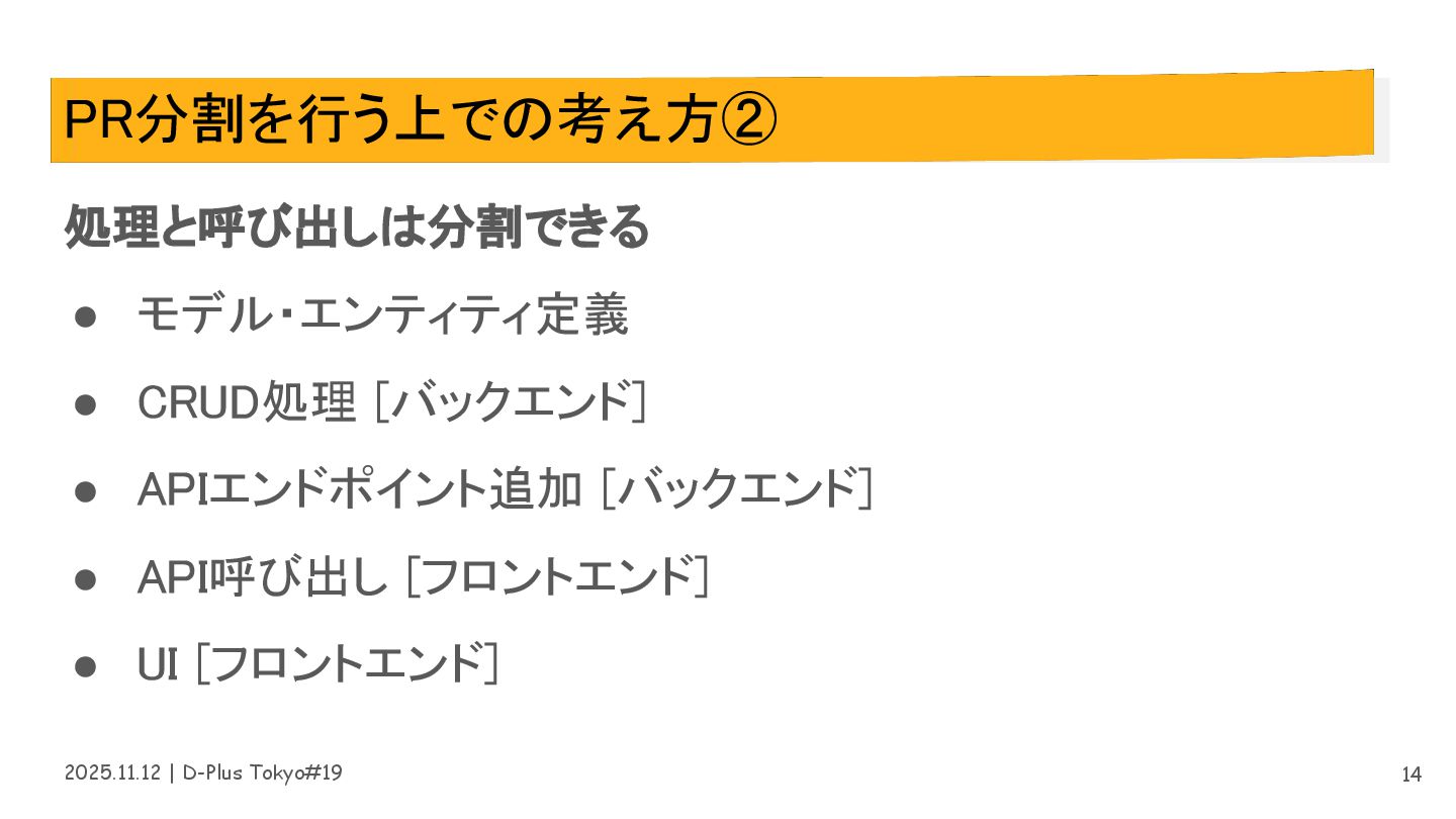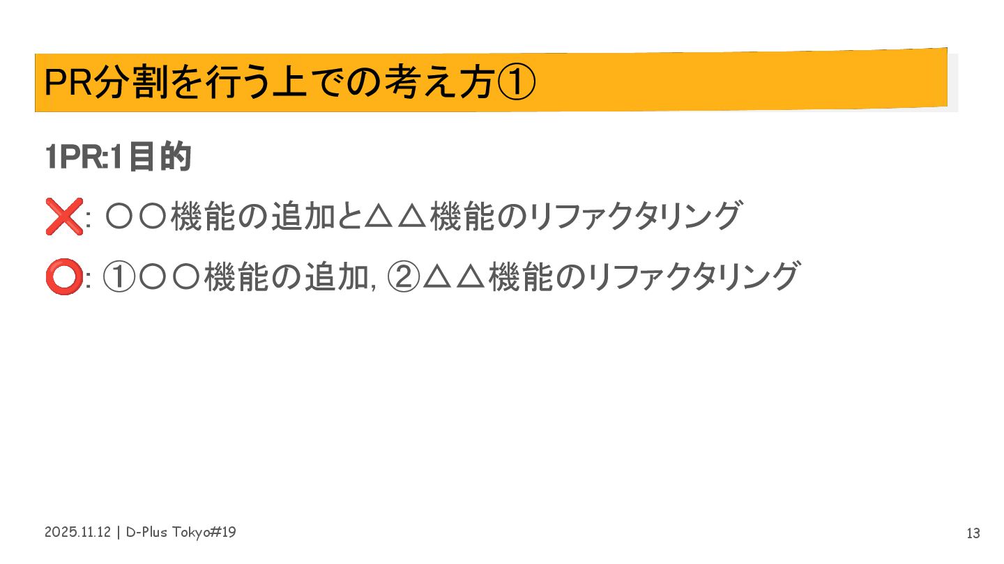 2025.11.12 | D-Plus Tokyo#19 PR分割を行う上での考え方① 1PR:1目的 ❌: 〇〇機能の追加と△△機能のリファクタリング ⭕:
