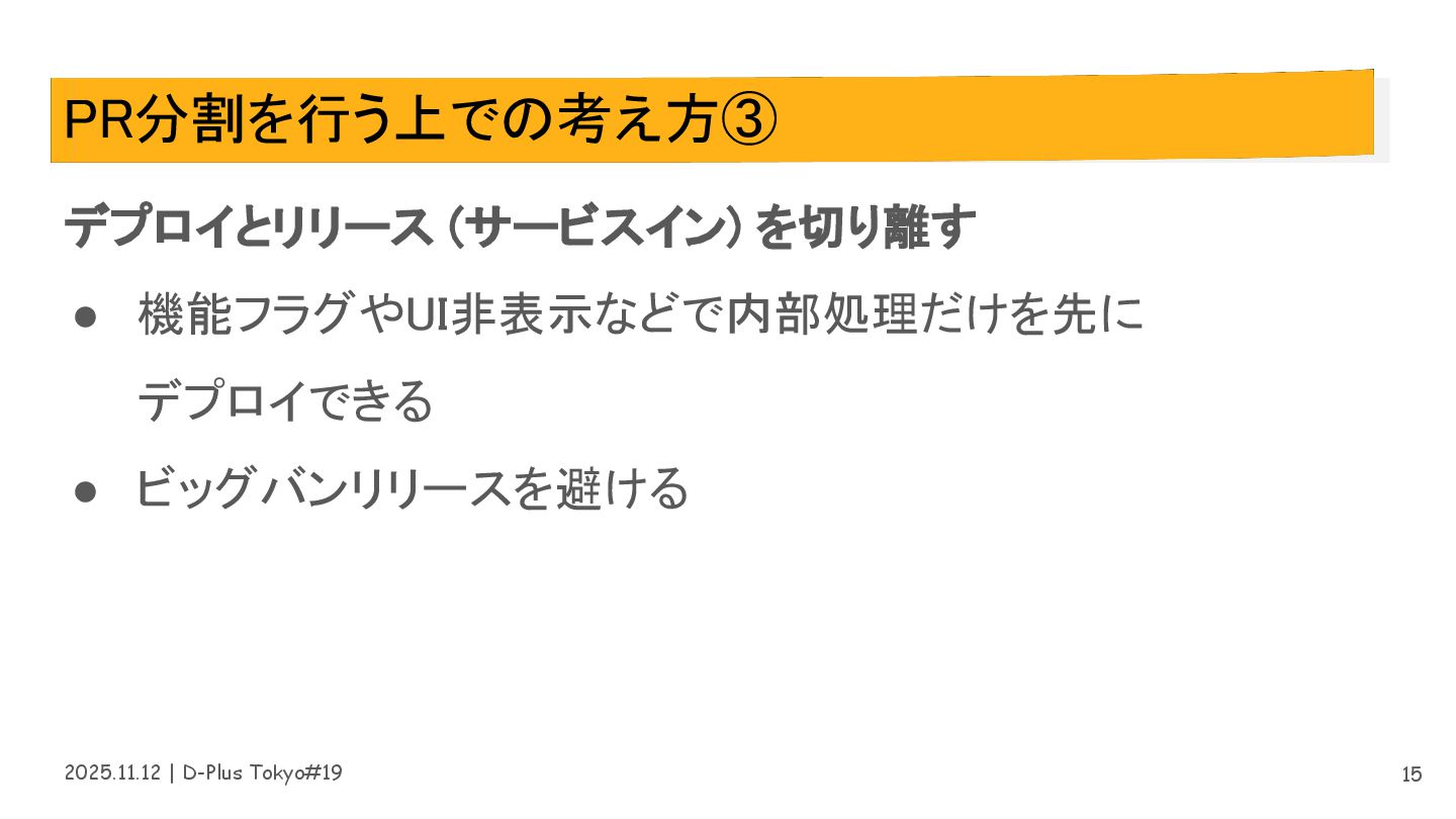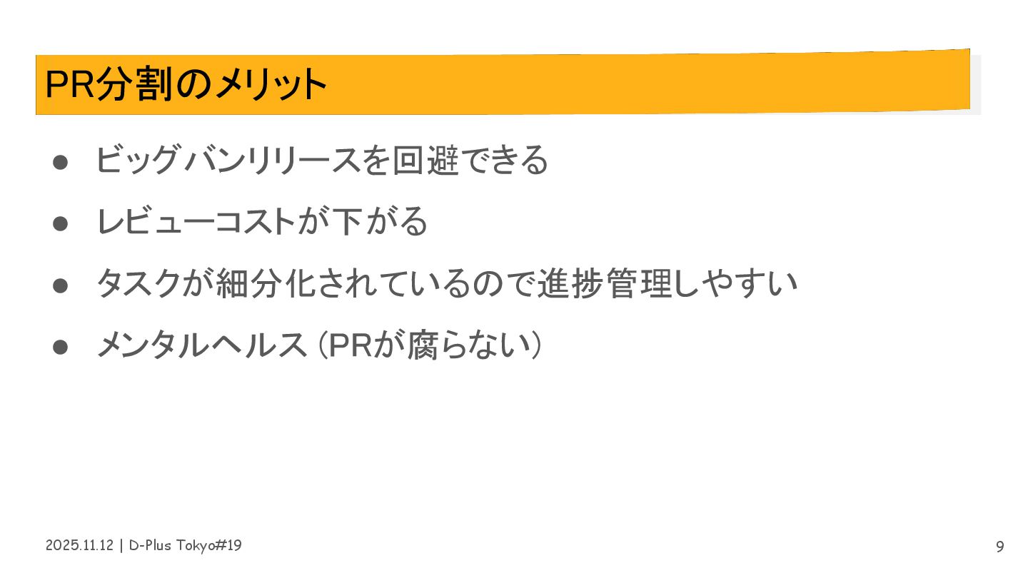 2025.11.12 | D-Plus Tokyo#19 PR分割のメリット • ビッグバンリリースを回避できる • レビューコストが下がる •