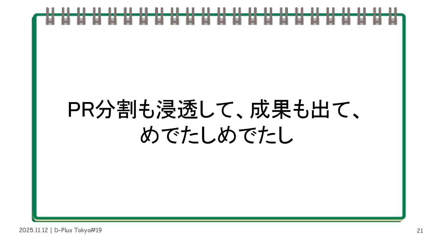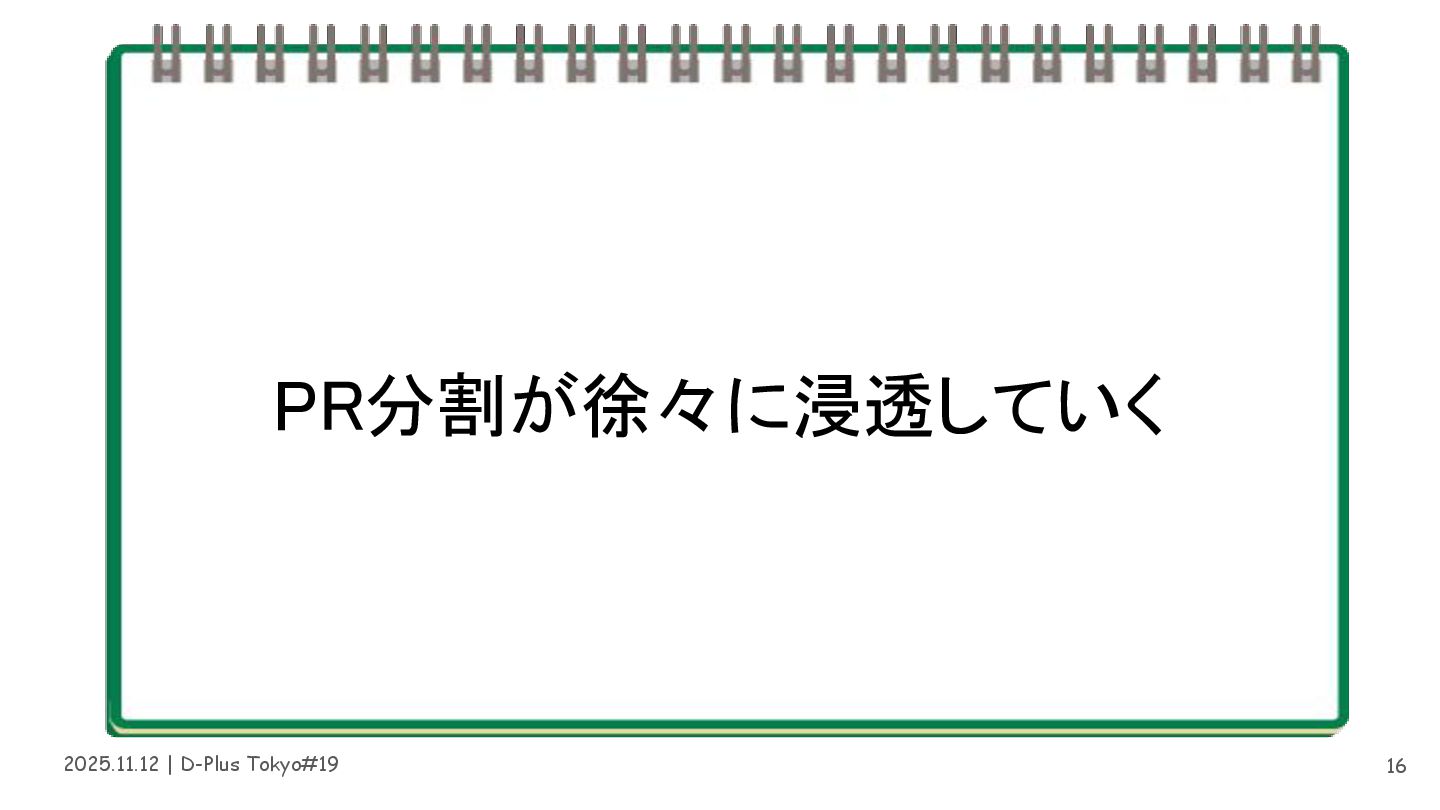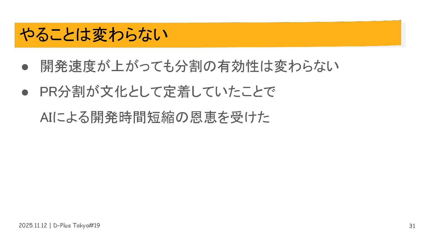2025.11.12 | D-Plus Tokyo#19 やることは変わらない • 開発速度が上がっても分割の有効性は変わらない • PR分割が文化として定着していたことで AIによる開発時間短縮の恩恵を受けた