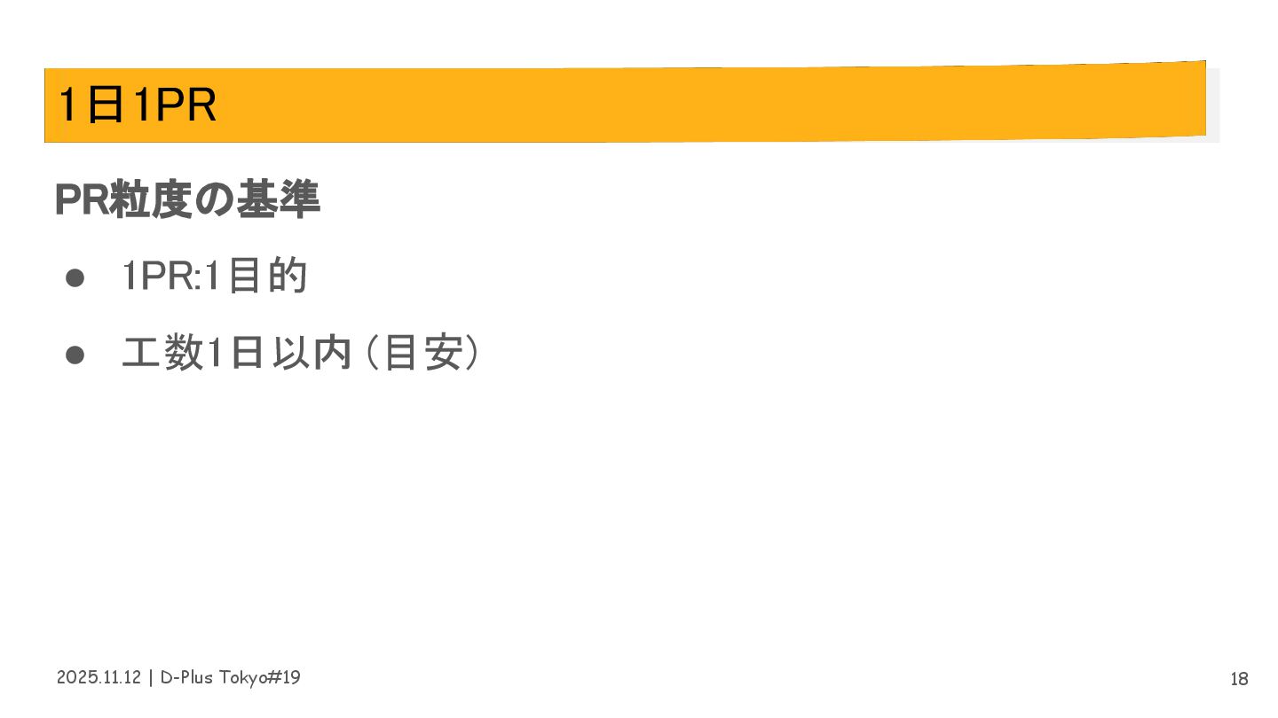2025.11.12 | D-Plus Tokyo#19 1日1PR PR粒度の基準 • 1PR:1目的 •