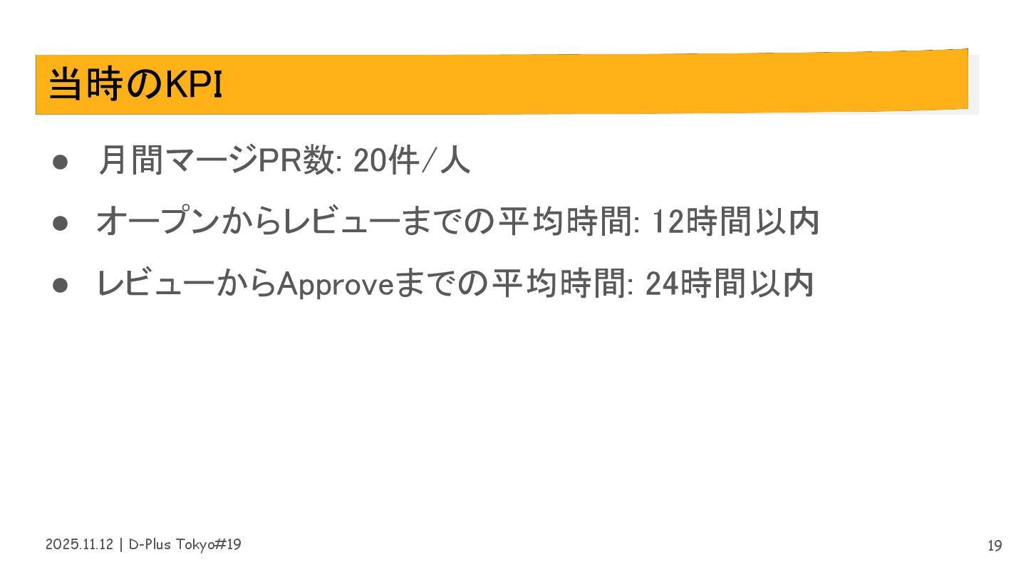 2025.11.12 | D-Plus Tokyo#19 当時のKPI • 月間マージPR数: 20件/人 • オープンからレビューまでの平均時間: