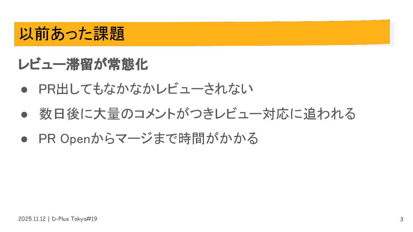 2025.11.12 | D-Plus Tokyo#19 以前あった課題 レビュー滞留が常態化 • PR出してもなかなかレビューされない •