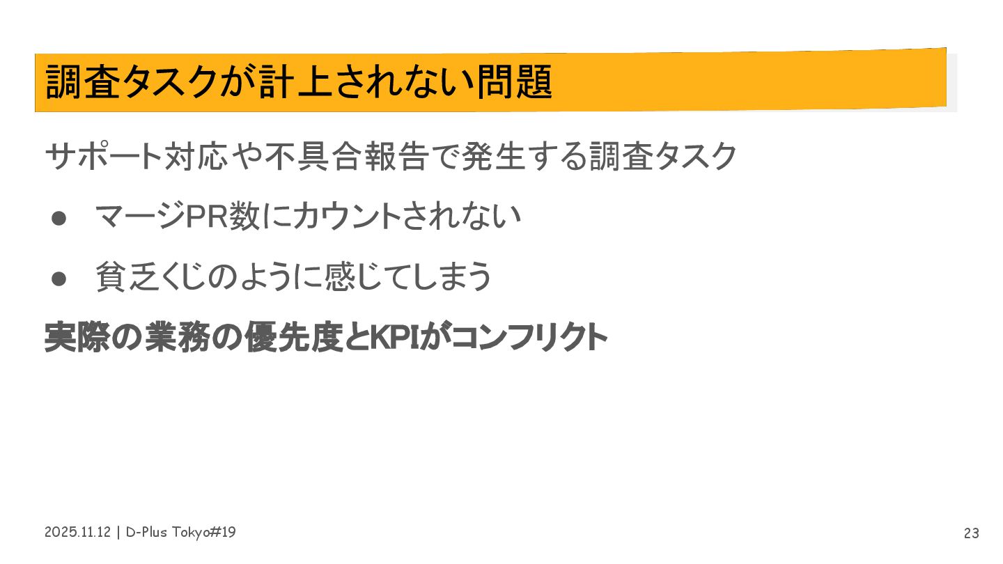 2025.11.12 | D-Plus Tokyo#19 調査タスクが計上されない問題 サポート対応や不具合報告で発生する調査タスク • マージPR数にカウントされない • 貧乏くじのように感じてしまう