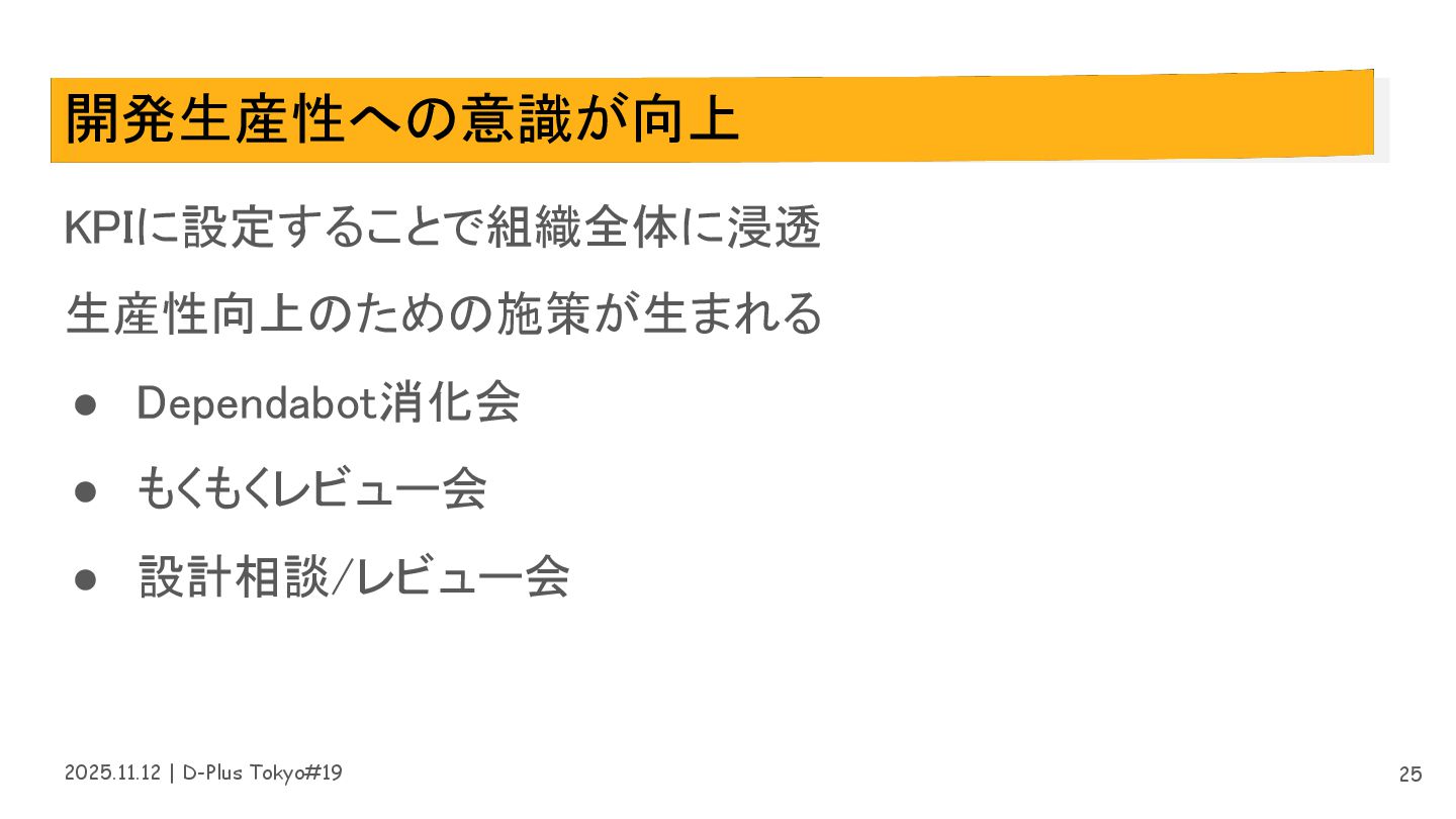 2025.11.12 | D-Plus Tokyo#19 開発生産性への意識が向上 KPIに設定することで組織全体に浸透 生産性向上のための施策が生まれる • Dependabot消化会 •