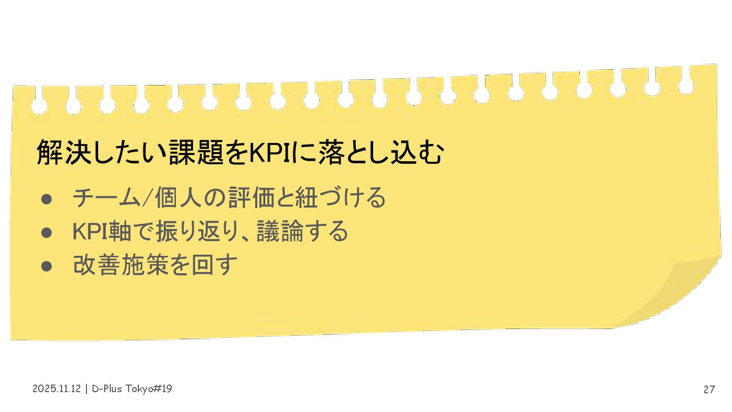 2025.11.12 | D-Plus Tokyo#19 27 解決したい課題をKPIに落とし込む • チーム/個人の評価と紐づける • KPI軸で振り返り、議論する