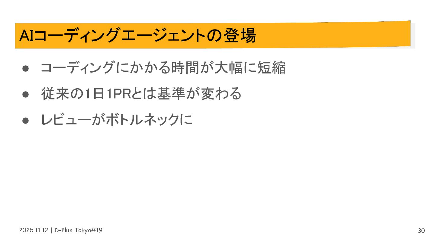 2025.11.12 | D-Plus Tokyo#19 AIコーディングエージェントの登場 • コーディングにかかる時間が大幅に短縮 • 従来の1日1PRとは基準が変わる •