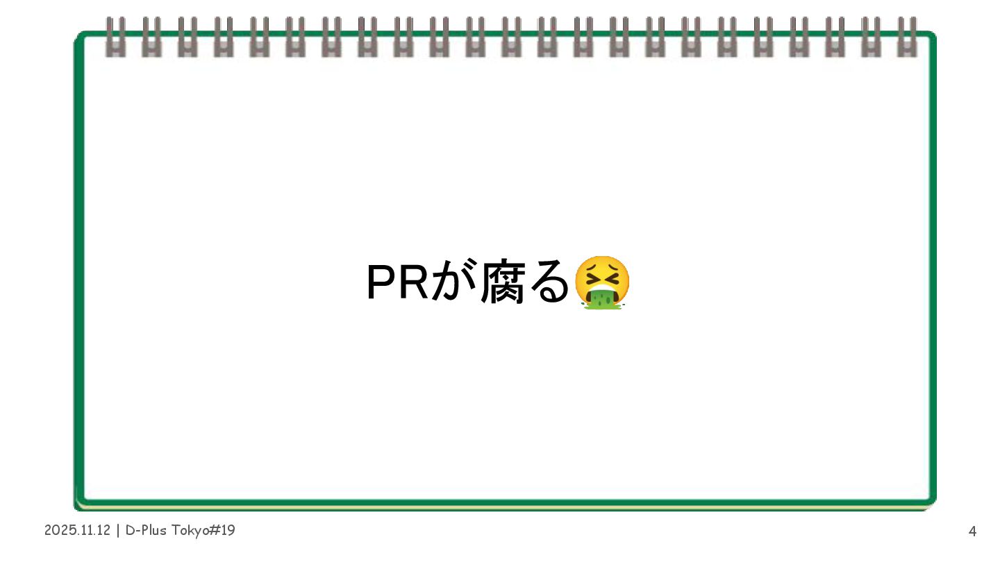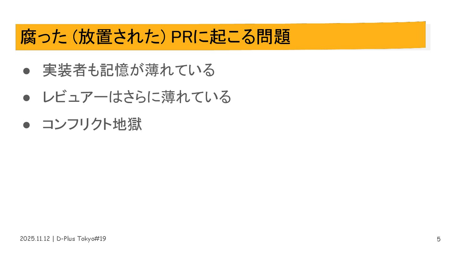 2025.11.12 | D-Plus Tokyo#19 腐った (放置された) PRに起こる問題 • 実装者も記憶が薄れている •