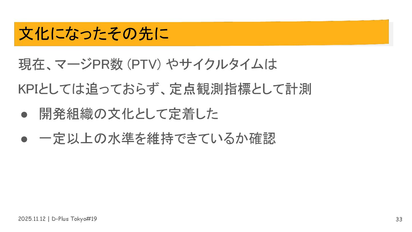 2025.11.12 | D-Plus Tokyo#19 文化になったその先に 現在、マージPR数 (PTV) やサイクルタイムは KPIとしては追っておらず、定点観測指標として計測 •