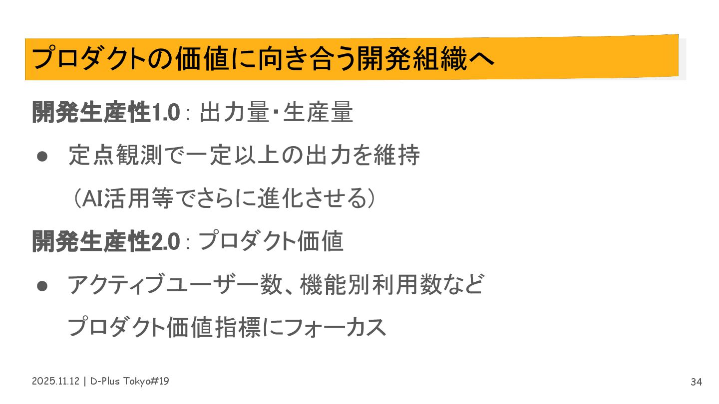 2025.11.12 | D-Plus Tokyo#19 プロダクトの価値に向き合う開発組織へ 開発生産性1.0 : 出力量・生産量 • 定点観測で一定以上の出力を維持