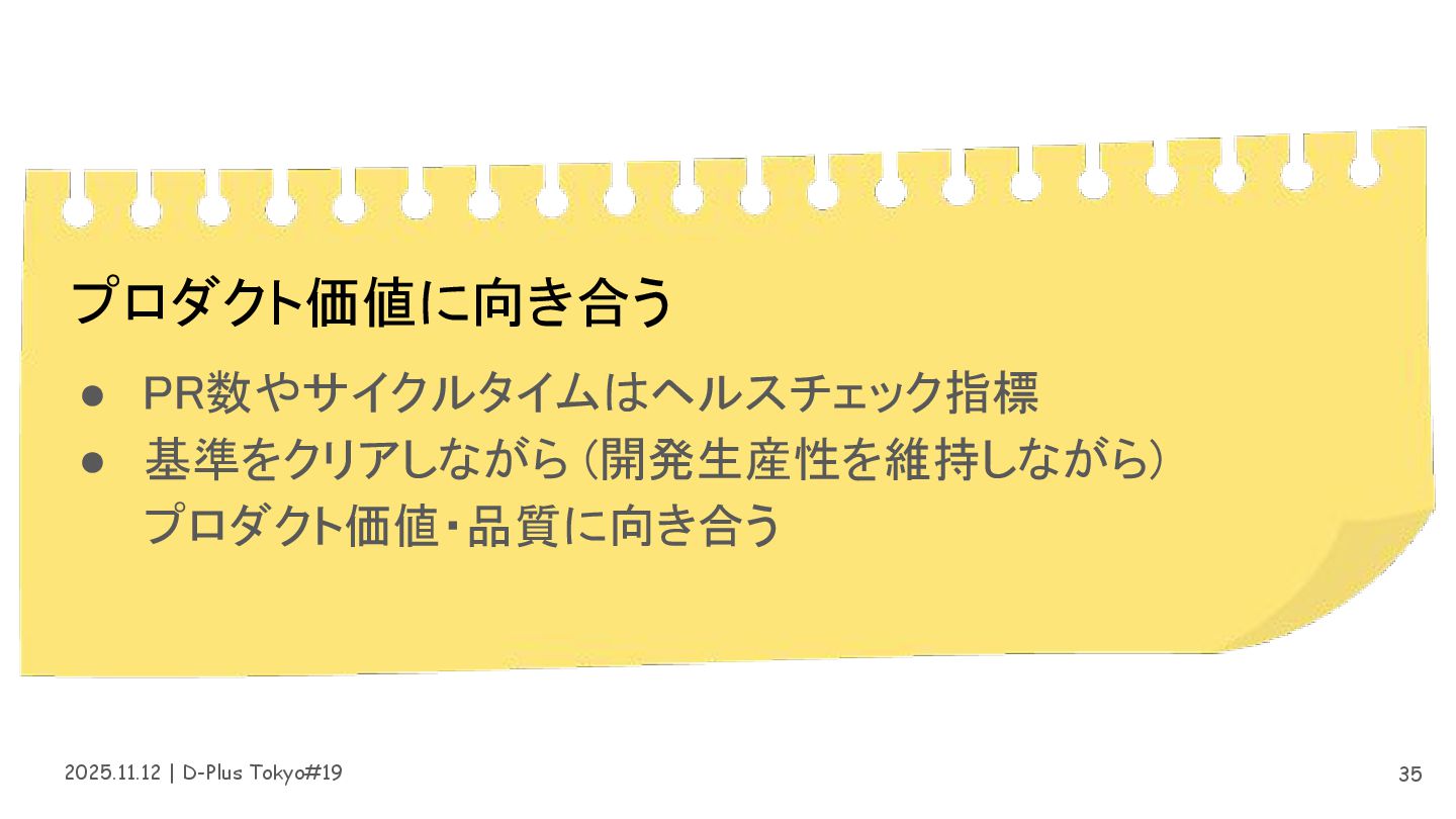 2025.11.12 | D-Plus Tokyo#19 35 プロダクト価値に向き合う • PR数やサイクルタイムはヘルスチェック指標 • 基準をクリアしながら