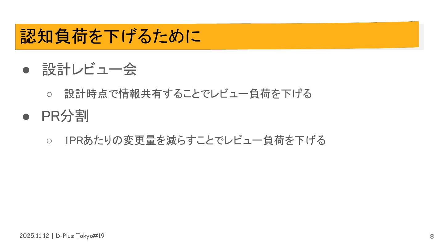 2025.11.12 | D-Plus Tokyo#19 認知負荷を下げるために • 設計レビュー会 ◦ 設計時点で情報共有することでレビュー負荷を下げる •