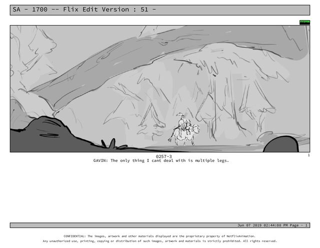 Jun 07 2019 02:44:08 PM Page - 1 CONFIDENTIAL: The images, artwork and other materials displayed are the proprietary property of NetflixAnimation. Any unauthorized use, printing, copying or distribution of such images, artwork and materials is strictly prohibited. All rights reserved. 0257-3 GAVIN: The only thing I cant deal with is multiple legs. 1 NEW