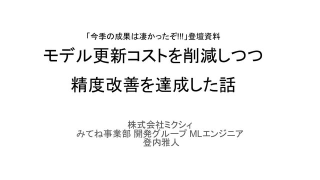 「今季の成果は凄かったぞ!!!」登壇資料 モデル更新コストを削減しつつ 精度改善を達成した話 株式会社ミクシィ みてね事業部 開発グループ MLエンジニア 登内雅人