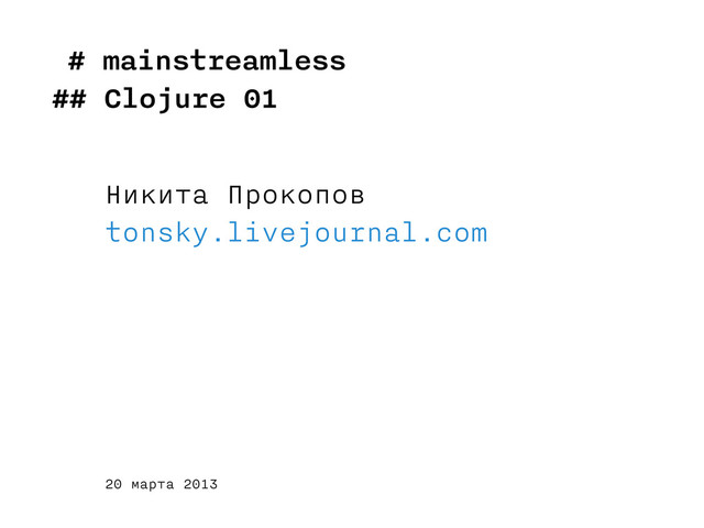 # mainstreamless ## Clojure 01 Никита Прокопов tonsky.livejournal.com 20 марта