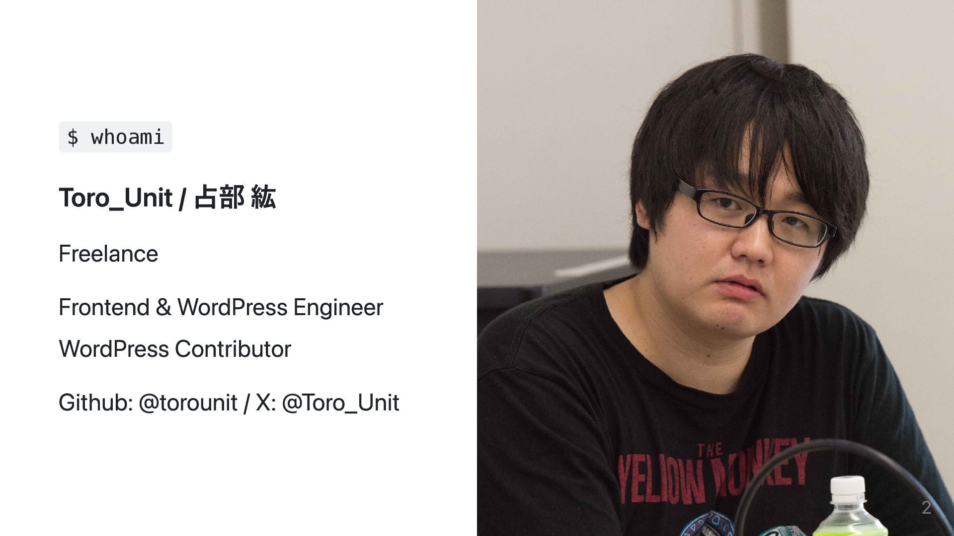 Engineer WordPress Contributor Github: @torounit / X: @Toro_Unit 2