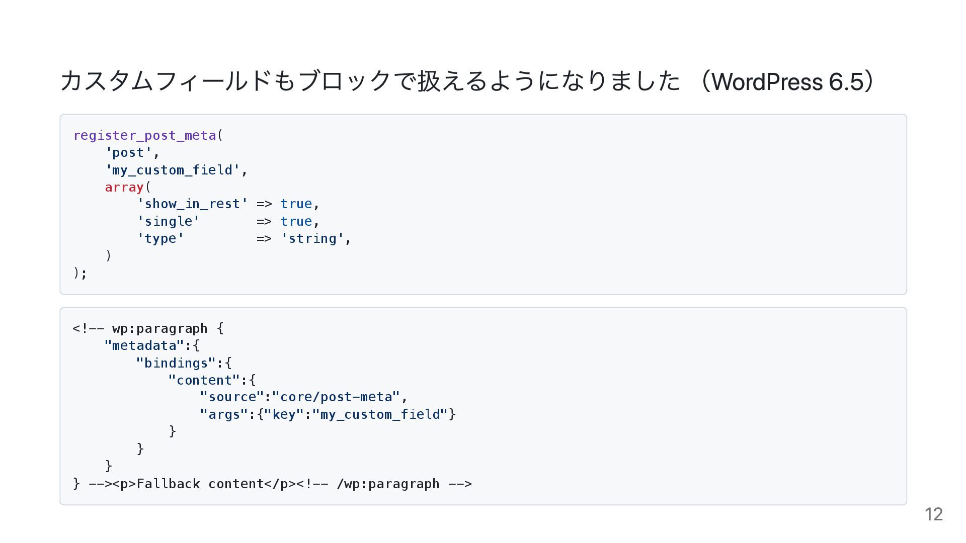 5. カスタムフィールドもブロックで扱えるようになりました (WordPress 6.5) register_post_meta( 'post', 'my_custom_field', array( 'show_in_rest' => true,