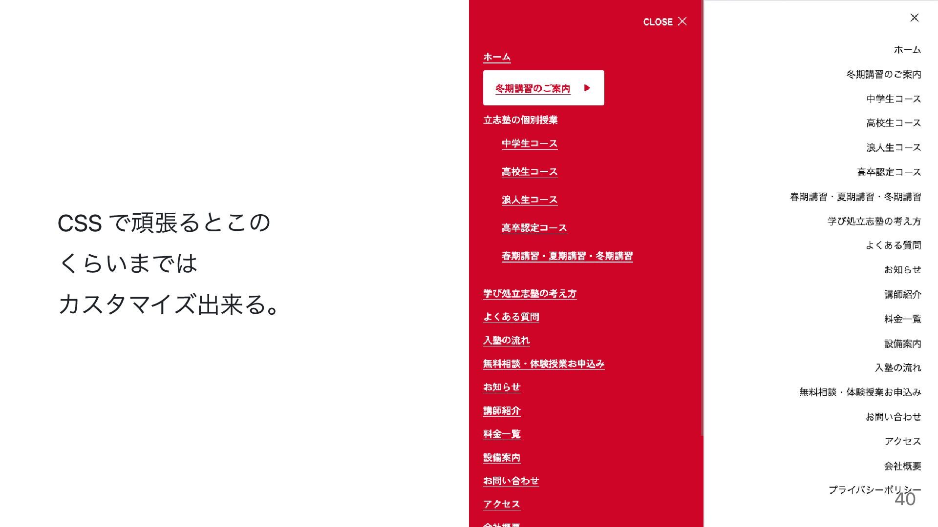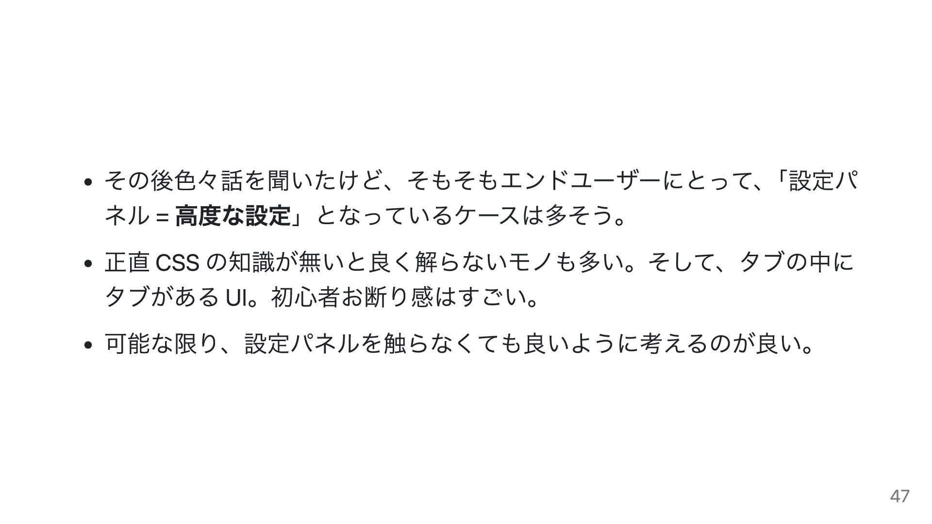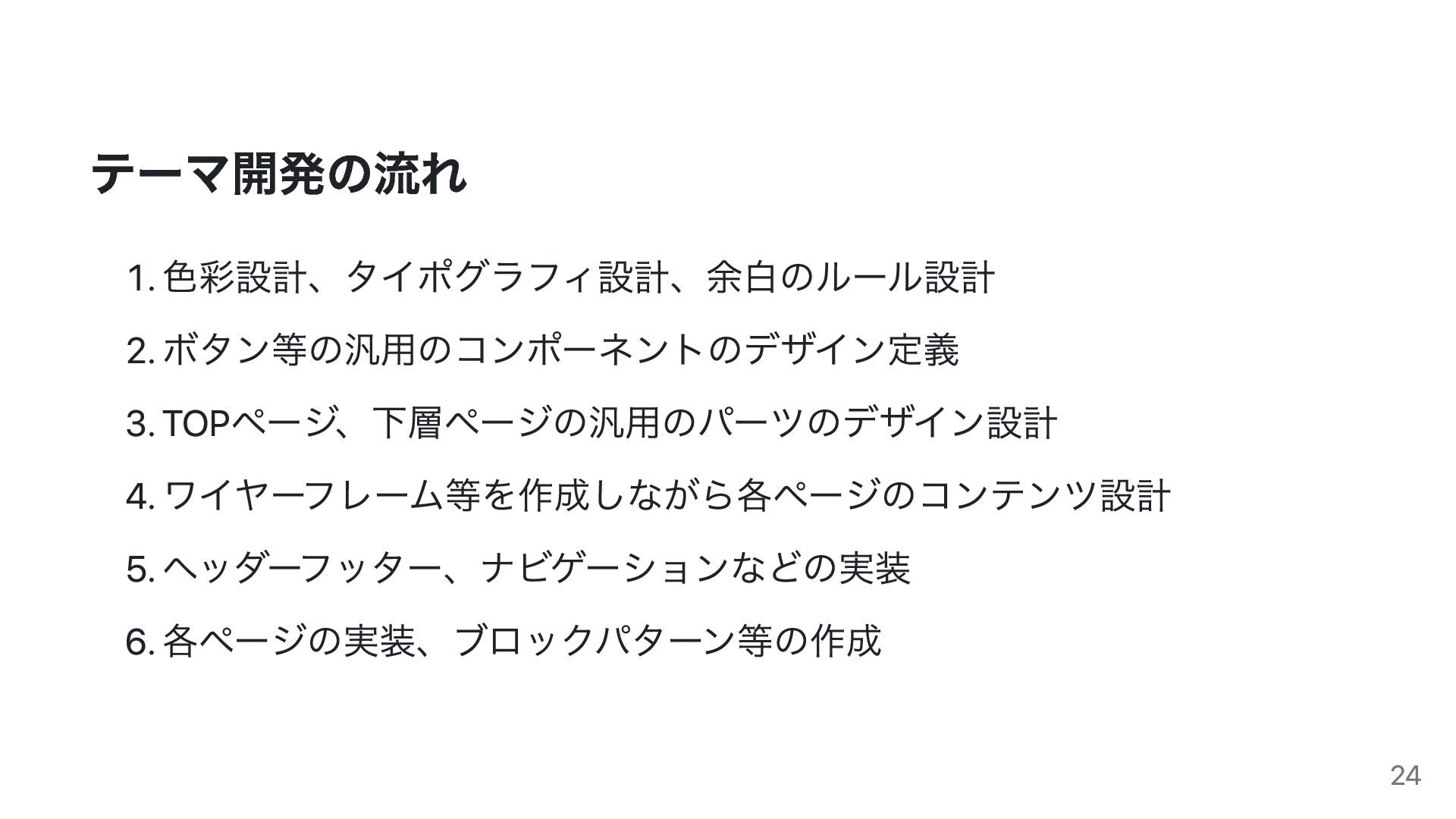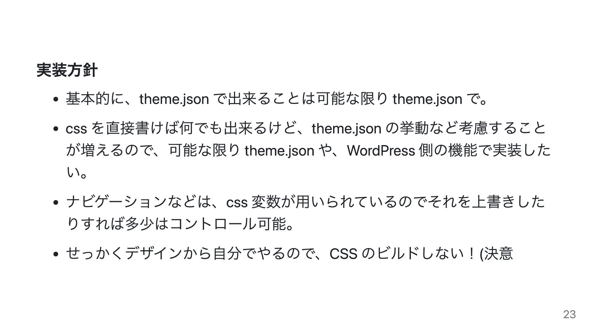 や、WordPress 側の機能で実装した い。 ナビゲーションなどは、css 変数が用いられているのでそれを上書きした りすれば多少はコントロール可能。 せっかくデザインから自分でやるので、CSS のビルドしない!(決意 23