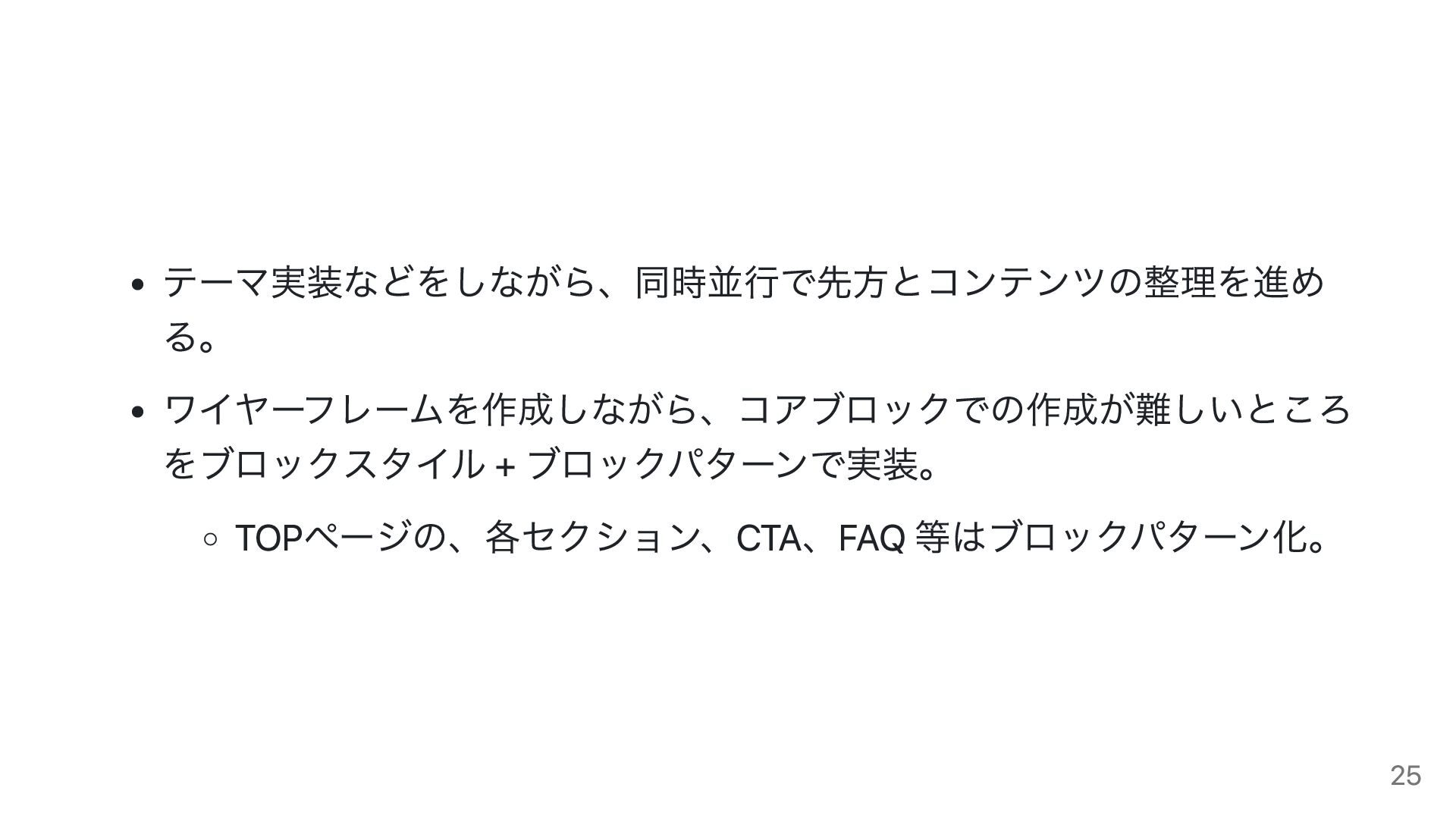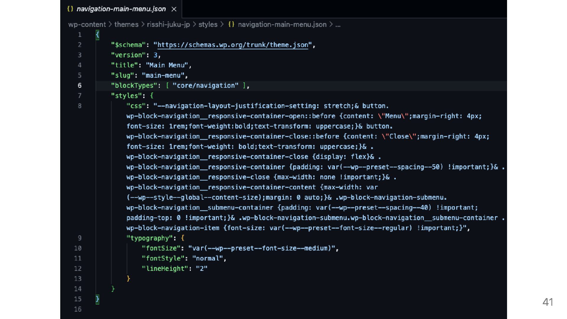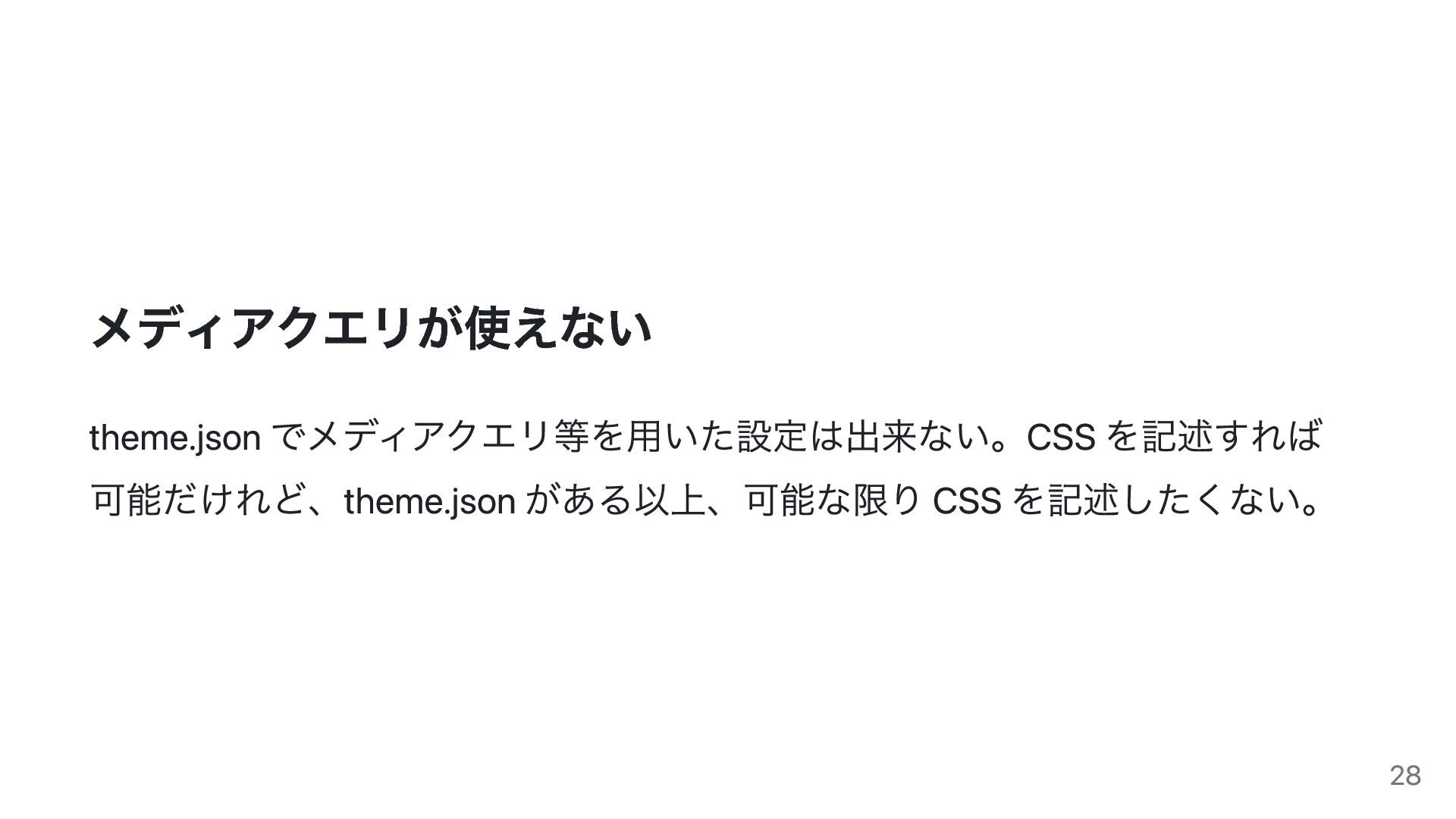 10. 実装方針 基本的に、theme.json で出来ることは可能な限り theme.json で。 css を直接書けば何でも出来るけど、theme.json の挙動など考慮すること が増えるので、可能な限り theme.json