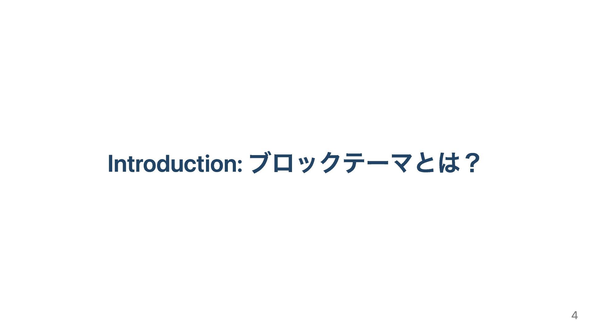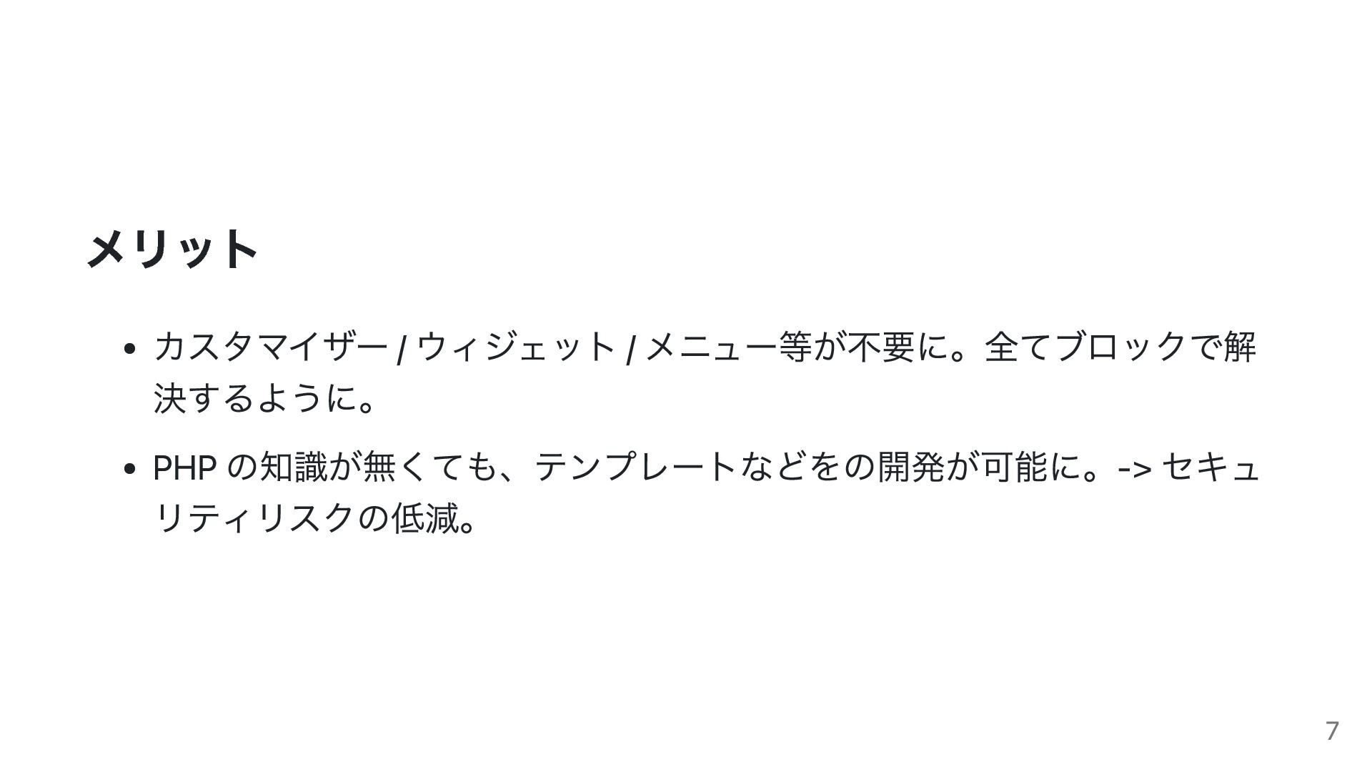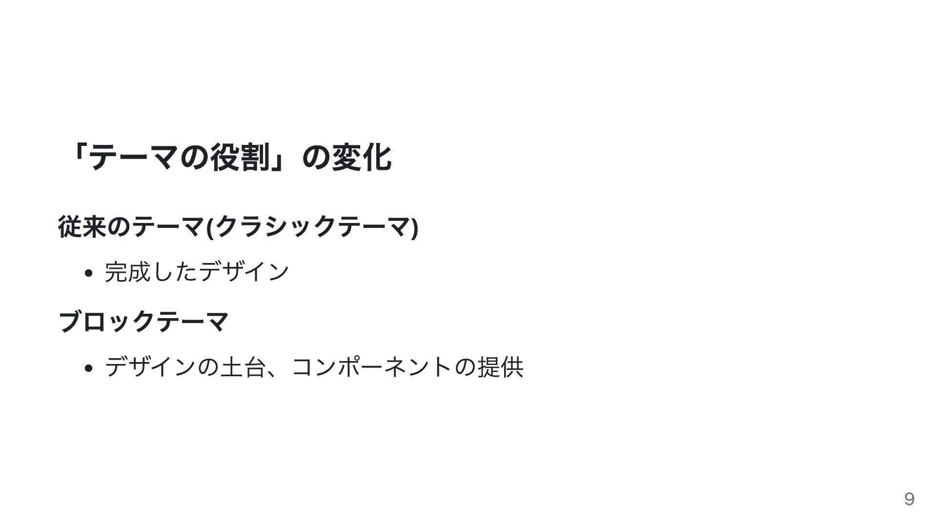 Editing, FSE) に対応。 従来のテーマと異なり、PHP テンプレートファイルを持たず、HTML テン プレートと theme.json で構成される。 ブロックエディターを使用して、サイト全体のレイアウトやデザインをカ スタマイズ可能。 ここ数年のデフォルトテーマ (Twenty Twenty-Two 以降) は全てブロックテ ーマ。 6