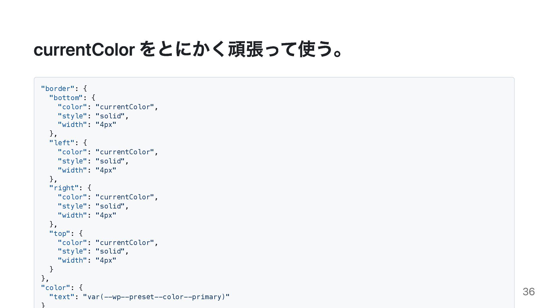 14. currentColor をとにかく頑張って使う。 "border": { "bottom": { "color": "currentColor", "style": "solid",