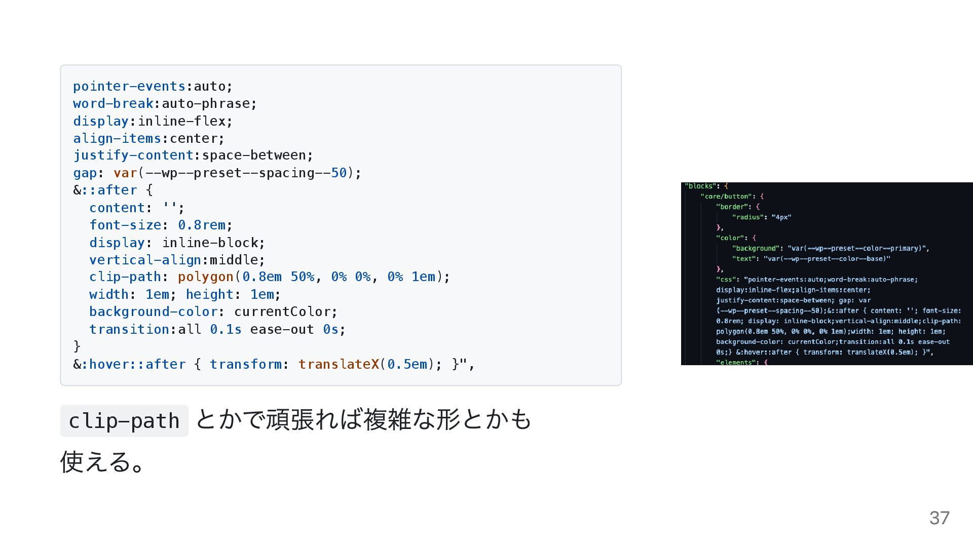 ''; font-size: 0.8rem; display: inline-block; vertical-align:middle; clip-path: polygon(0.8em 50%, 0% 0%, 0% 1em); width: 1em; height: 1em; background-color: currentColor; transition:all 0.1s ease-out 0s; } &:hover::after { transform: translateX(0.5em); }", clip-path とかで頑張れば複雑な形とかも 使える。 37