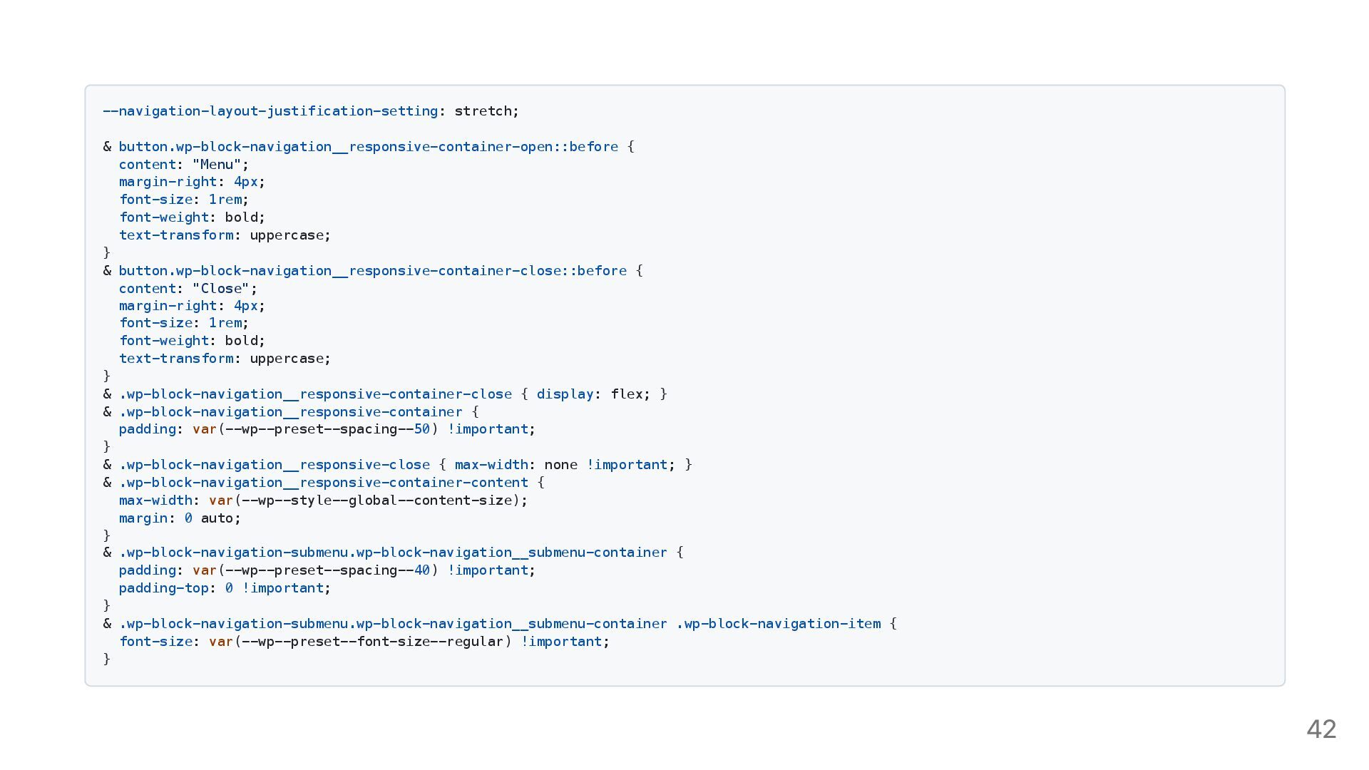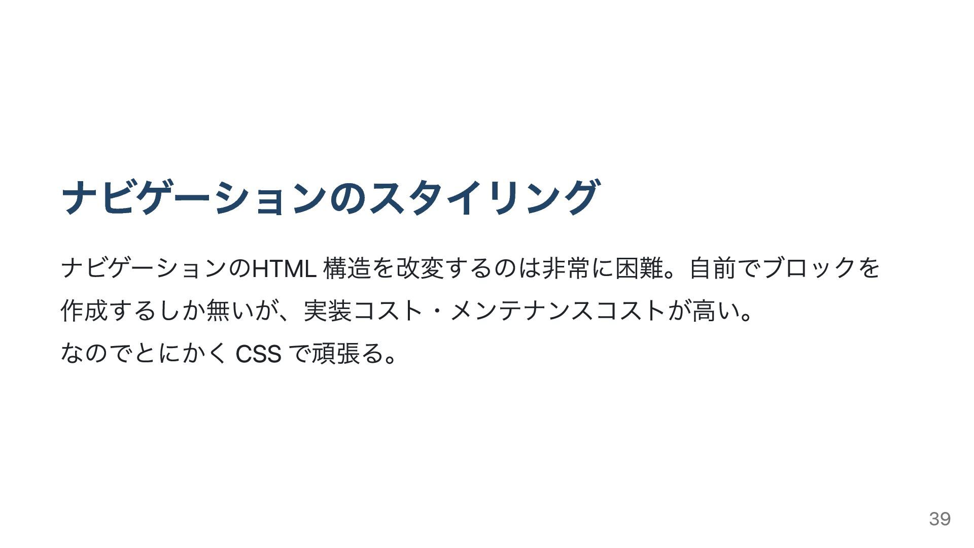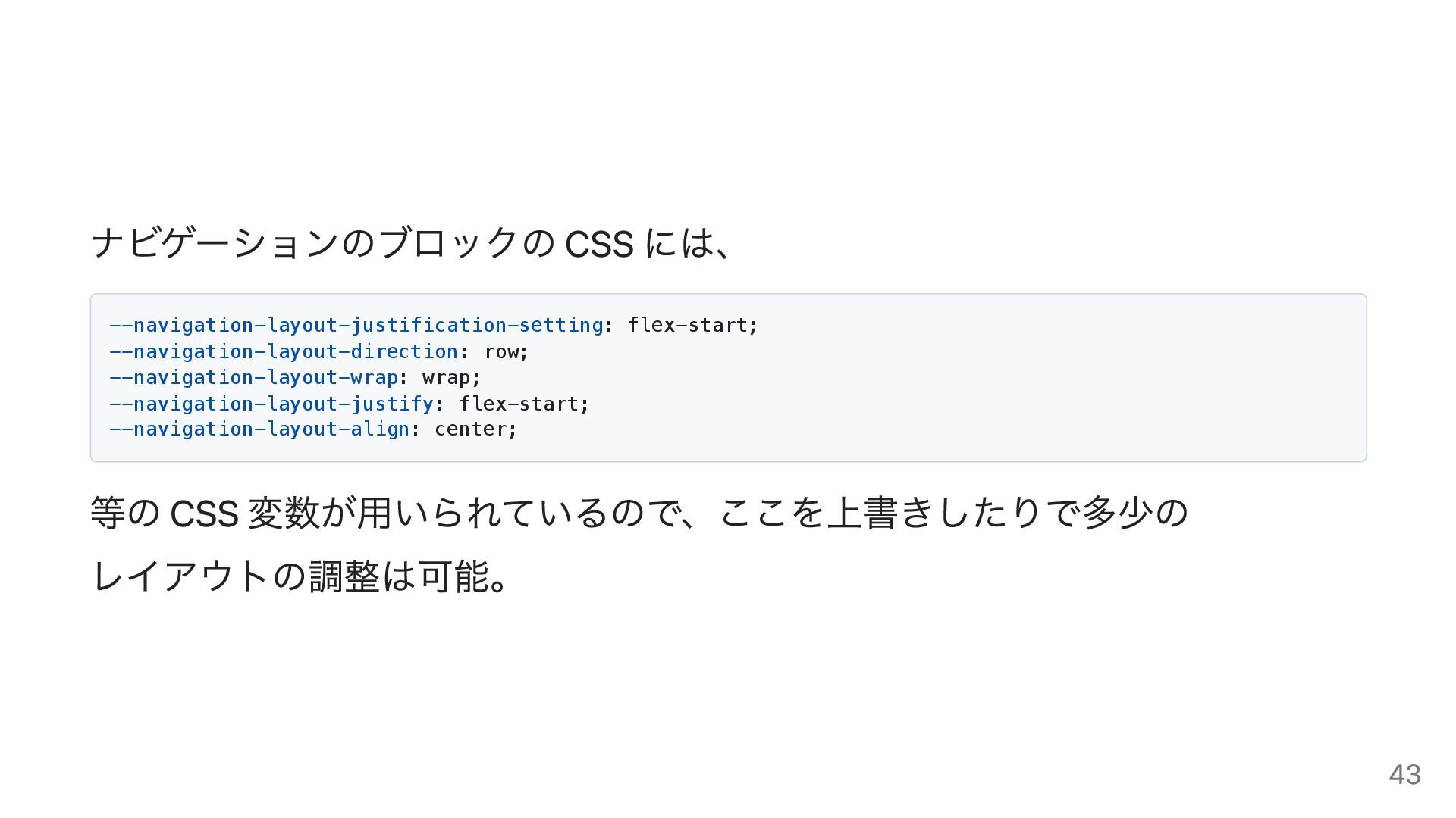 flex-start; --navigation-layout-align: center; 等の CSS 変数が用いられているので、ここを上書きしたりで多少の レイアウトの調整は可能。 43