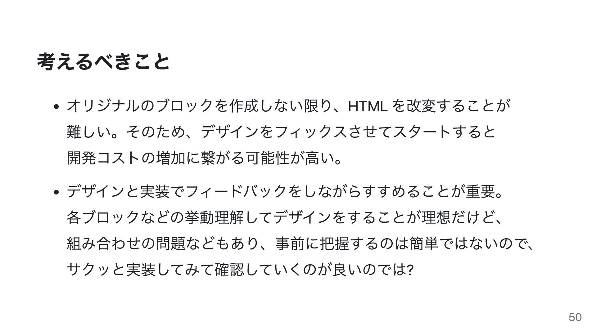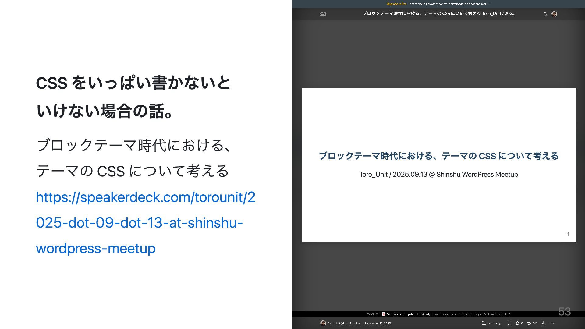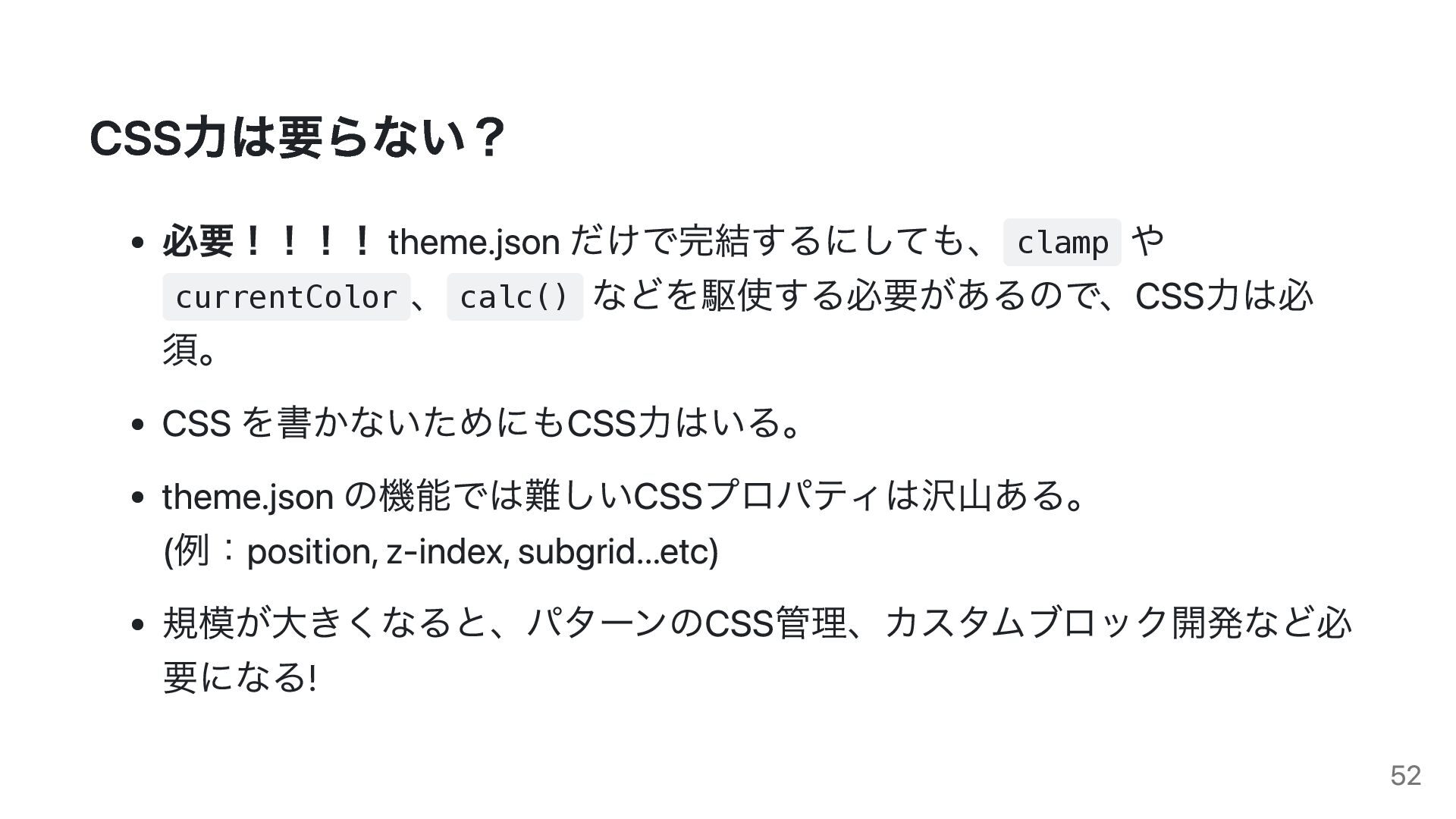須。 CSS を書かないためにもCSS力はいる。 theme.json の機能では難しいCSSプロパティは沢山ある。 (例:position, z-index, subgrid...etc) 規模が大きくなると、パターンのCSS管理、カスタムブロック開発など必 要になる! 52
