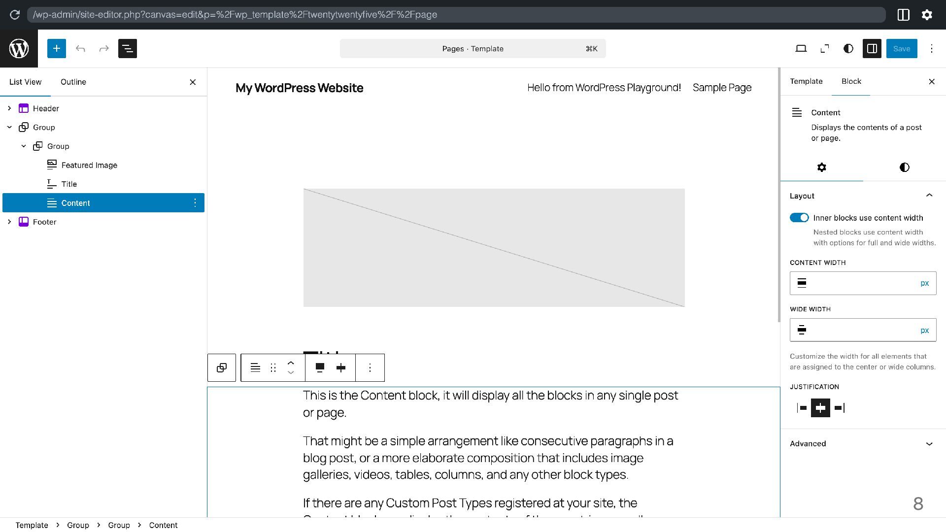 => 'My Custom Field', 'content' => '<!-- wp:paragraph { "metadata":{"bindings":{"content":{"source":"core/post-meta","args":{"key":"my_custom_field"}}}}} --> <p>Fallback content</p> <!-- /wp:paragraph -->', ) ); 13