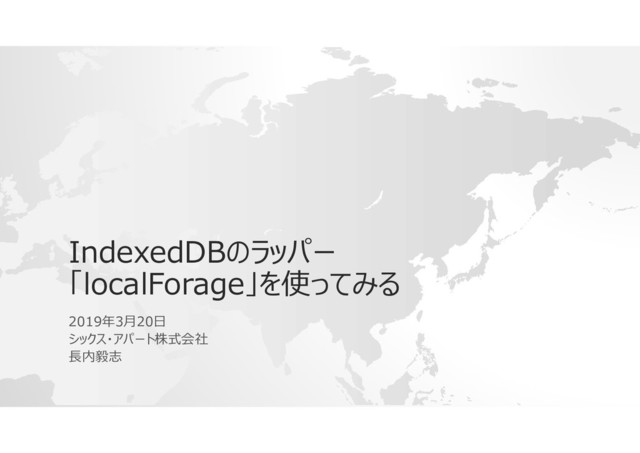 IndexedDBのラッパー 「localForage」を使ってみる 2019年3月20日 シックス・アパート株式会社 ⾧内毅志