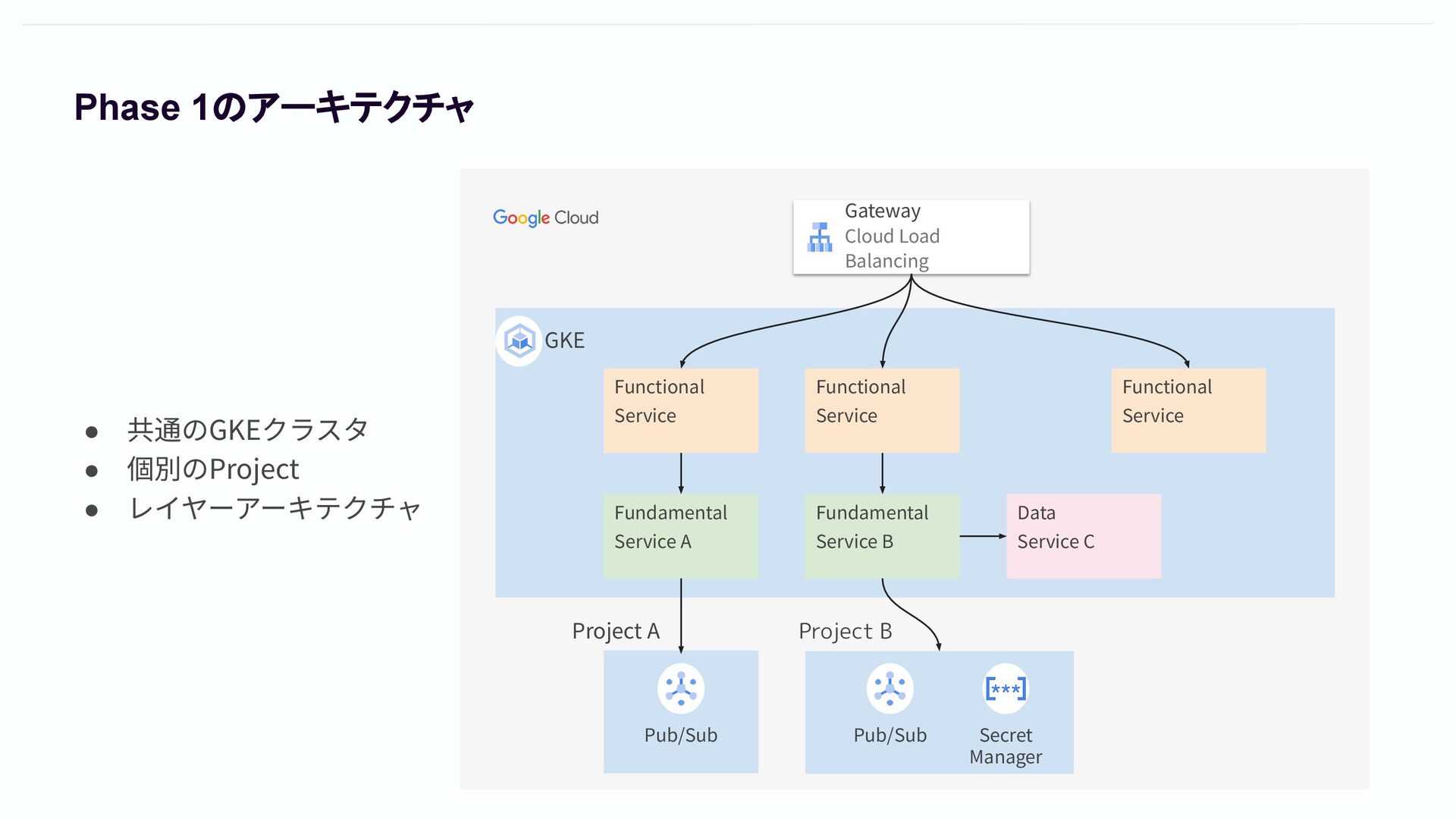 Load Balancing Functional Service Fundamental Service A Functional Service Functional Service Fundamental Service B Data Service C GKE Pub/Sub Project A Pub/Sub Secret Manager Project B