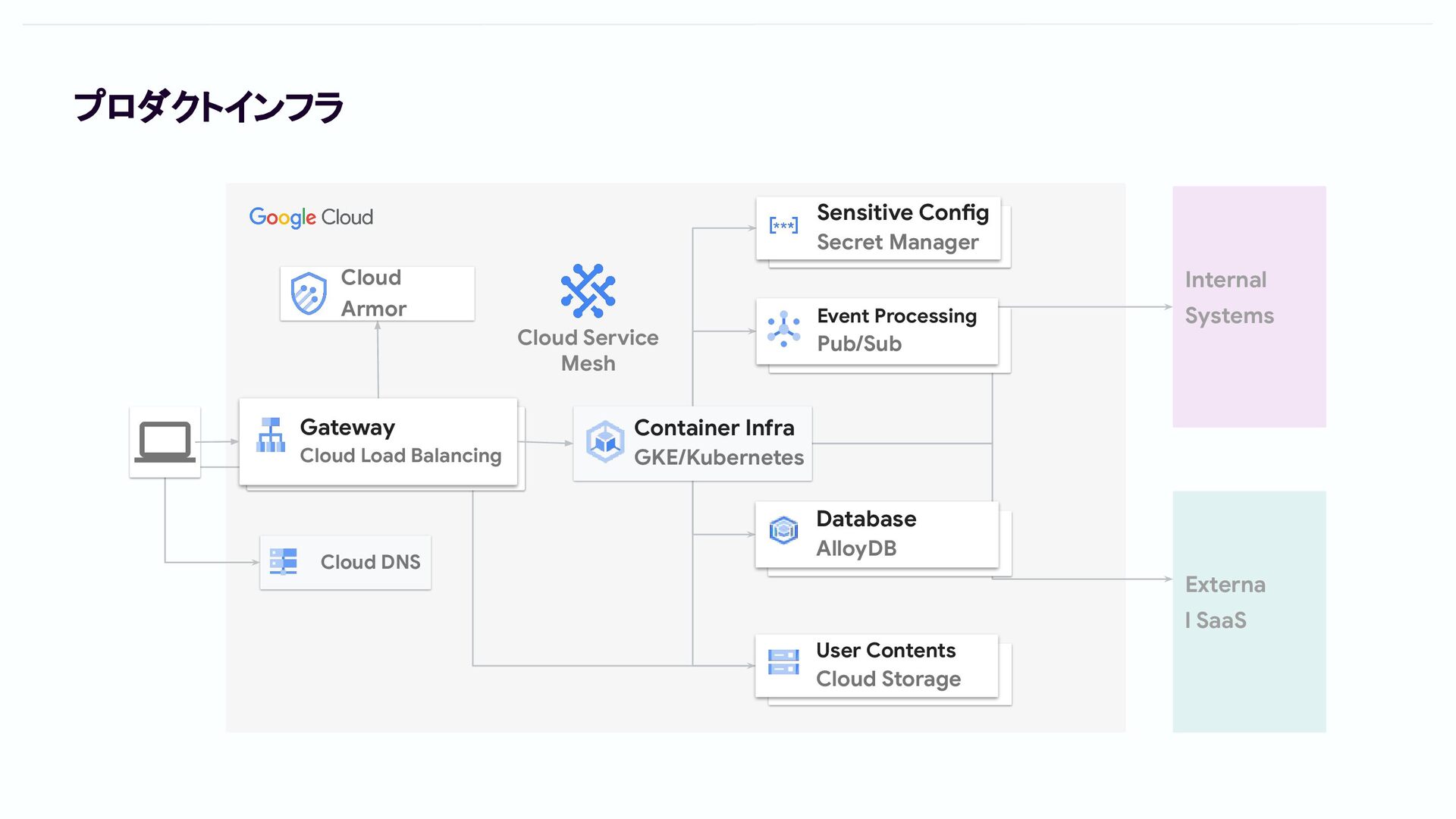 Cloud Service Mesh User Contents Cloud Storage Gateway Cloud Load Balancing Event Processing Pub/Sub Internal Systems Externa l SaaS Sensitive Con g Secret Manager