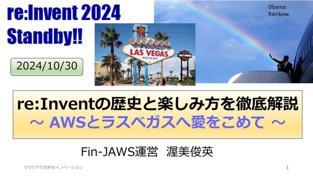 クラウドで日本をイノベーション 1 re:Inventの歴史と楽しみ方を徹底解説 ~ AWSとラスベガスへ愛をこめて ~ Fin-JAWS運営 渥美俊英 Obama Rainbow