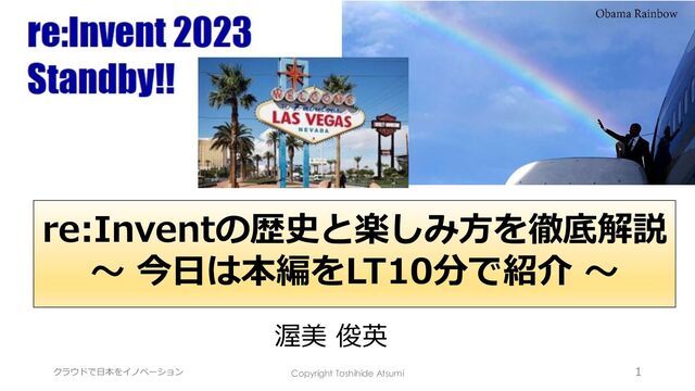 クラウドで日本をイノベーション Copyright Toshihide Atsumi 1 re:Inventの歴史と楽しみ方を徹底解説 ~ 今日は本編をLT10分で紹介 ~ 渥美
