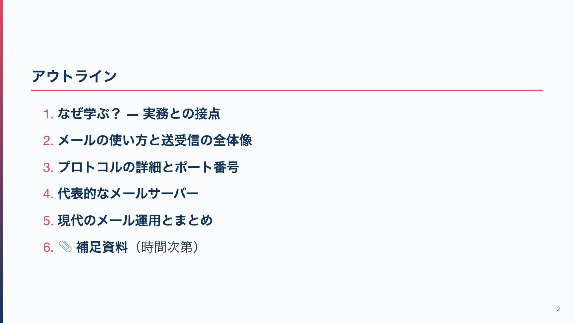 1. アウトライン 1. なぜ学ぶ? ― 実務との接点 2. メールの使い方と送受信の全体像 3. プロトコルの詳細とポート番号 4.